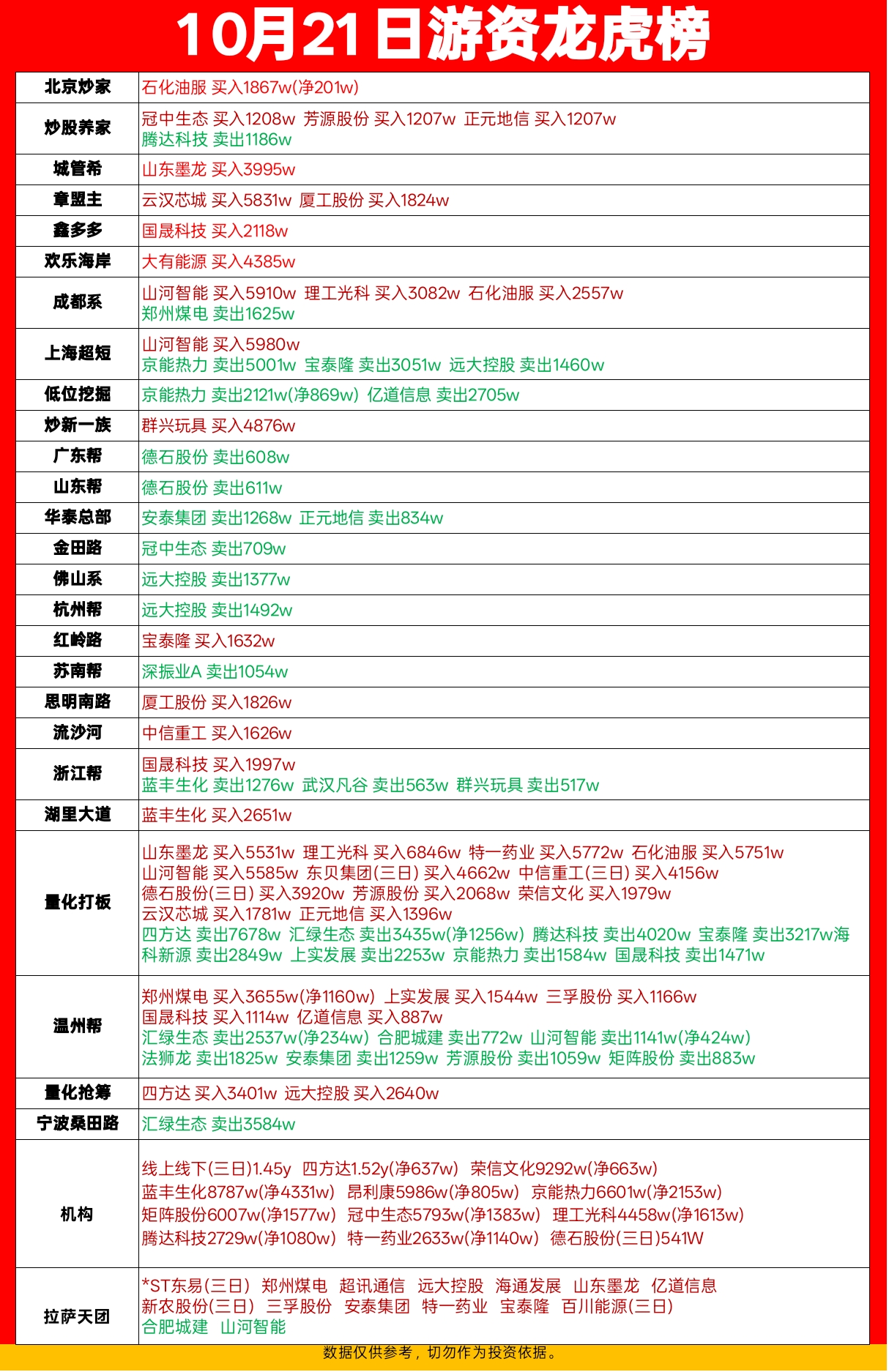 10.21游资龙虎榜,北京炒家章盟主佛山系上榜。