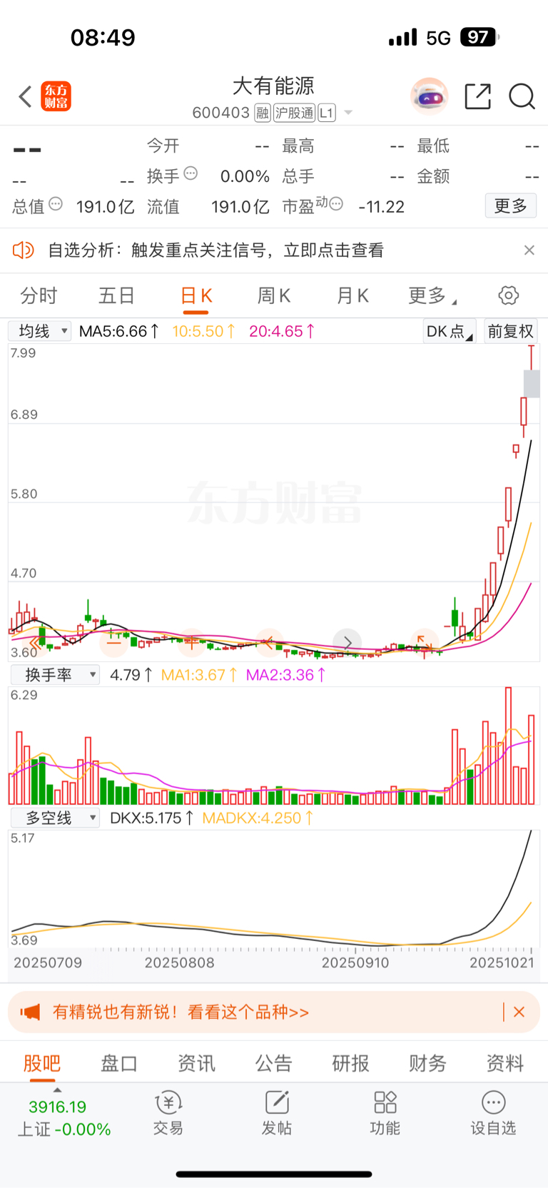 $大有能源(SH600403)$ 今天还有人敢追么,敢追的都是龙头选手,就算再翻倍也是应得的,印证了那句话收益与风险成正比!