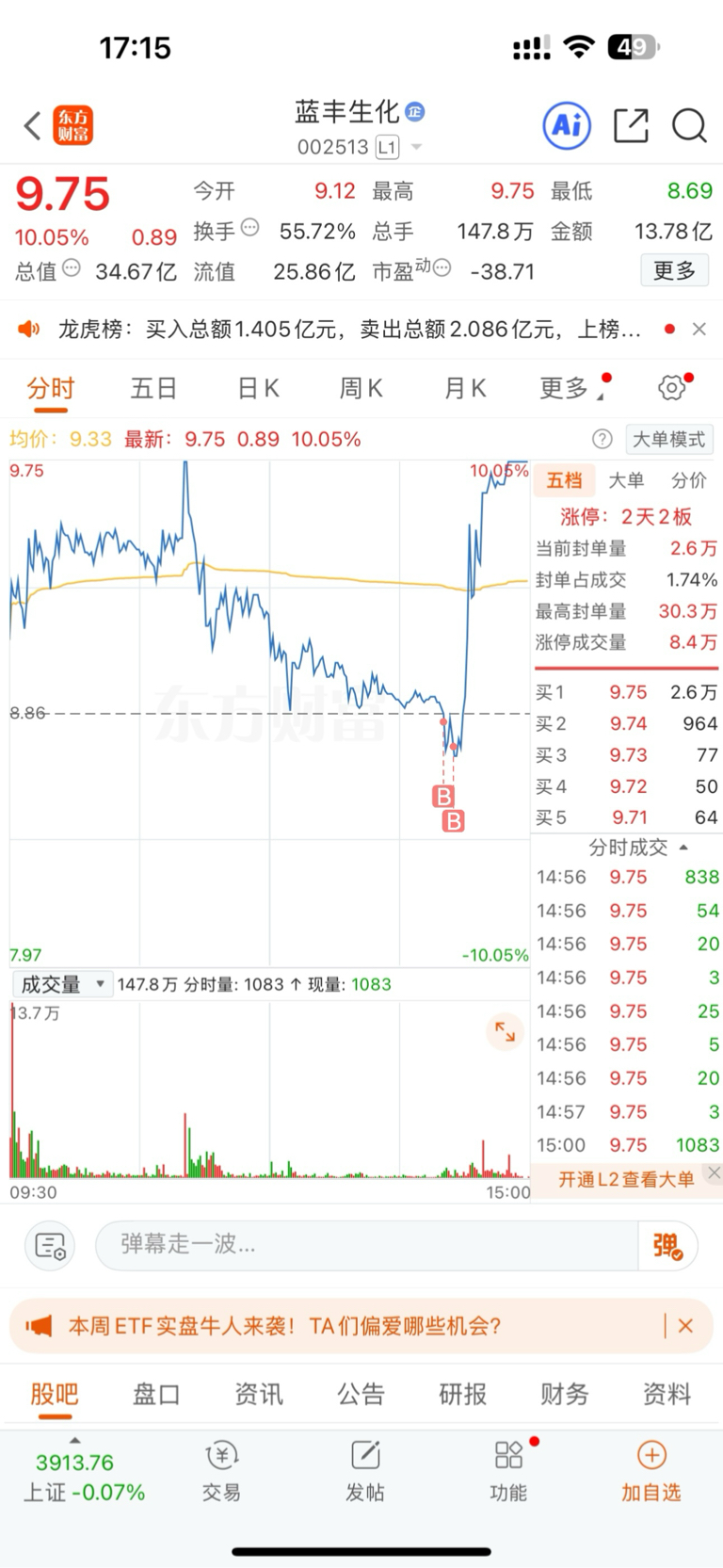 蓝丰生化:今日早盘触板回调,下影线延长之后资金有被护盘,并且午盘有断断续续资金抢筹,看来那就一个启动点,选择入场博弈,尾盘拉升涨停,是我意外收获,本想着明天会高开高走,谁知道幸福来的如此之快。