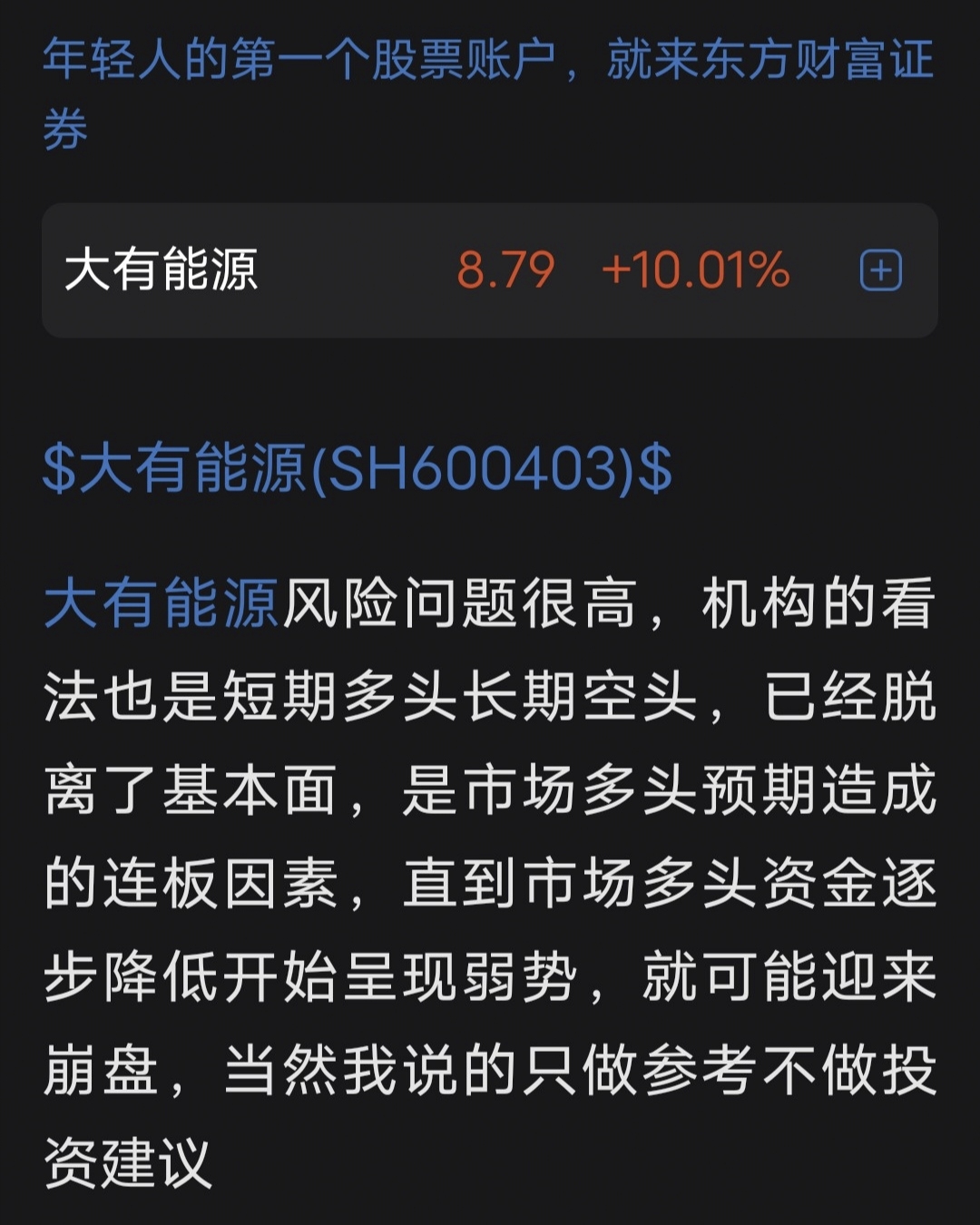 温馨提示: 1.根据《证券法》规定,禁止编造、传播虚假信息或者误导性信息,扰乱证券市场;2.用户在本社区发表的所有资料、言论等仅代表个人观点,与本网站立场无关,不对您构成任何投资建议。用户应基于自己的独立判断,自行决定证券投资并承担相应风险。《东方财富社区管理规定》