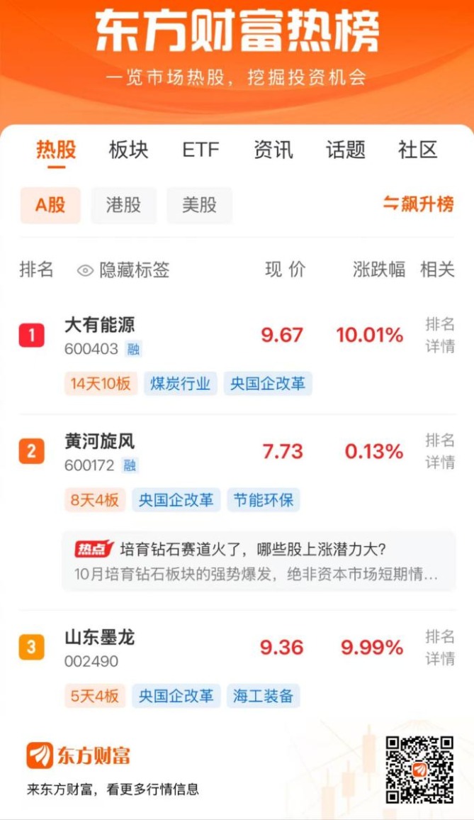 10月23日,两市震荡反弹,三大指数均小幅收涨。东方财富热股榜前三的股票中,大有能源位列第1,黄河旋风位列第2,山东墨龙位列第3。