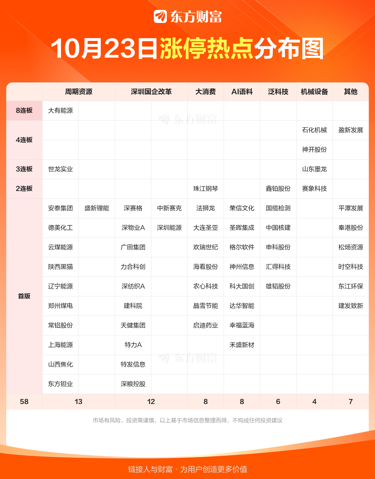 1 深圳国企改革 深圳发布重磅并购重组方案,提出到2027年上市公司总市值突破20万亿的战略目标,直接利好国企改革概念 相关个股:$建科院(300675)$、$深水规院(301038)$、$广田集团(002482)$、$深赛格(000058)$、$特发信息(000070)$ 2 量子计算 谷歌宣布量子算法新突破,运行速度比超级计算机快1.3万倍,推动量子计算概念股上涨。 相关个股:$科大国创(300520)$、$神州信息(000555)$、$格尔软件(603232)$、$国盾量子(688027)$、$铜牛信息(300895)$ 3 煤炭供改 煤炭企业三季度产销数据亮眼叠加行业供给侧改革预期升温,推动资金持续关注 相关个股:$陕西黑猫(601015)$(4天2板)、$山西焦化(600740)$、$云煤能源(600792)$(4天2板)、$上海能源(600508)$、$郑州煤电(600121)$(4天2板) 4 可控核聚变 资本市场对可控核聚变万亿级市场空间的预期推动板块活跃 相关个股:$辰光医疗(920300)$、$中国核建(601611)$、$东方钽业(000962)$、$融发核电(002366)$、$合锻智能(603011)$ 5 能源金属 锂电材料需求旺盛导致六氟磷酸锂价格大幅上涨,供需紧张推动板块上涨 相关个股:$盛新锂能(002240)$、$天华新能(300390)$、$融捷股份(002192)$、$西藏矿业(000762)$、$赣锋锂业(002460)$市场热点