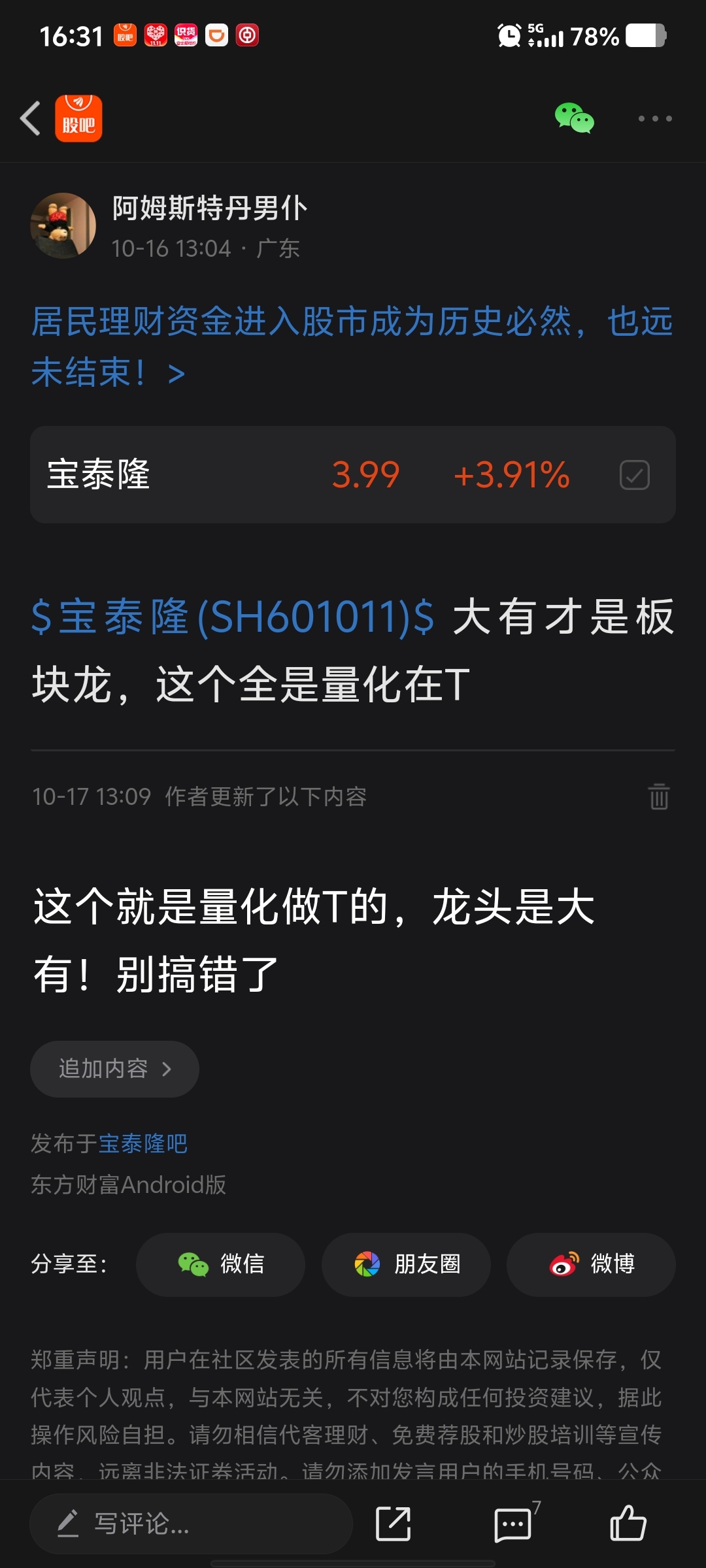 温馨提示: 1.根据《证券法》规定,禁止编造、传播虚假信息或者误导性信息,扰乱证券市场;2.用户在本社区发表的所有资料、言论等仅代表个人观点,与本网站立场无关,不对您构成任何投资建议。用户应基于自己的独立判断,自行决定证券投资并承担相应风险。《东方财富社区管理规定》
