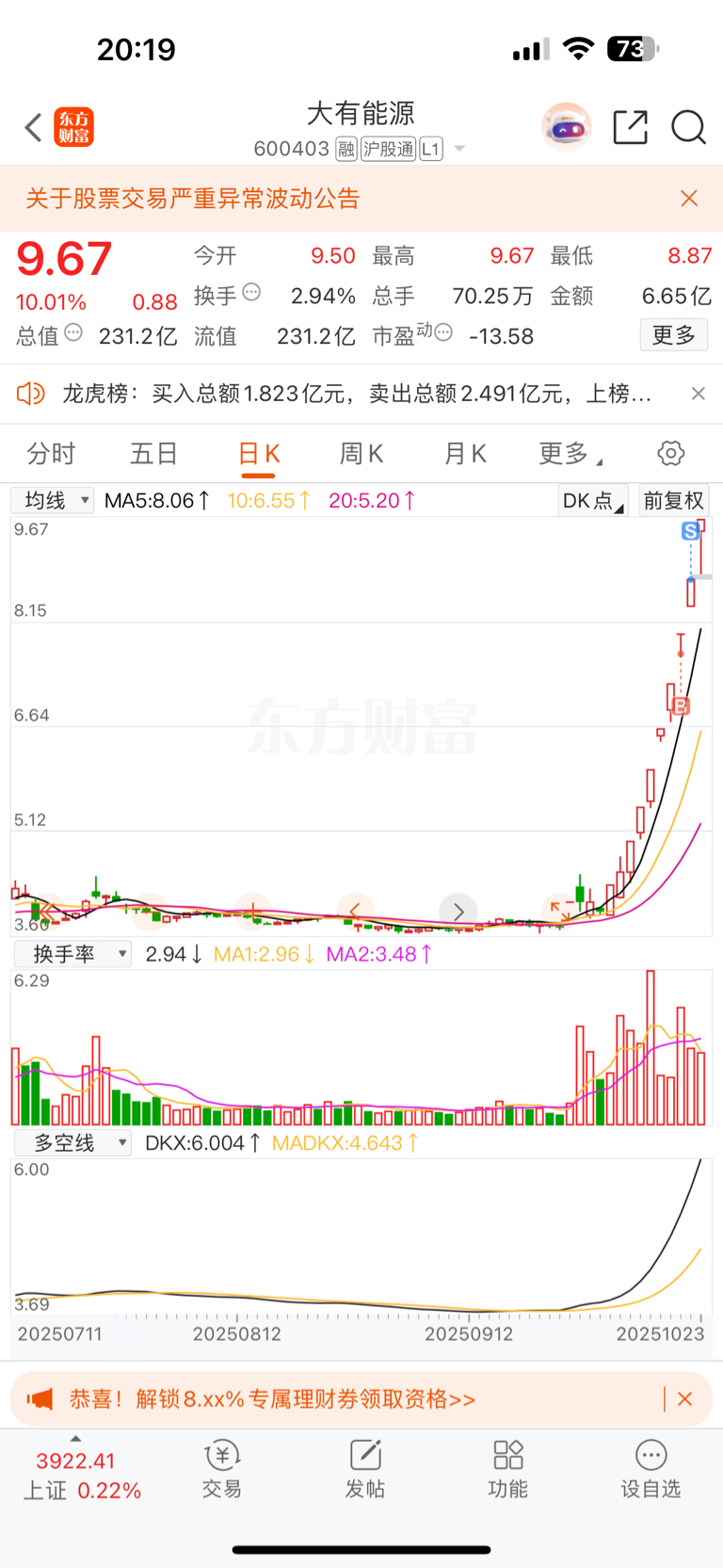 $大有能源(SH600403)$ 昨天卖出大有,卖飞了,今天超预期高开8个点,早盘挂单绿盘低吸没吸到,目前只看看就好了,他能飞多高都不会去追了,当然希望他飞越高越好!#收盘点评# #炒股日记# #复盘记录#
