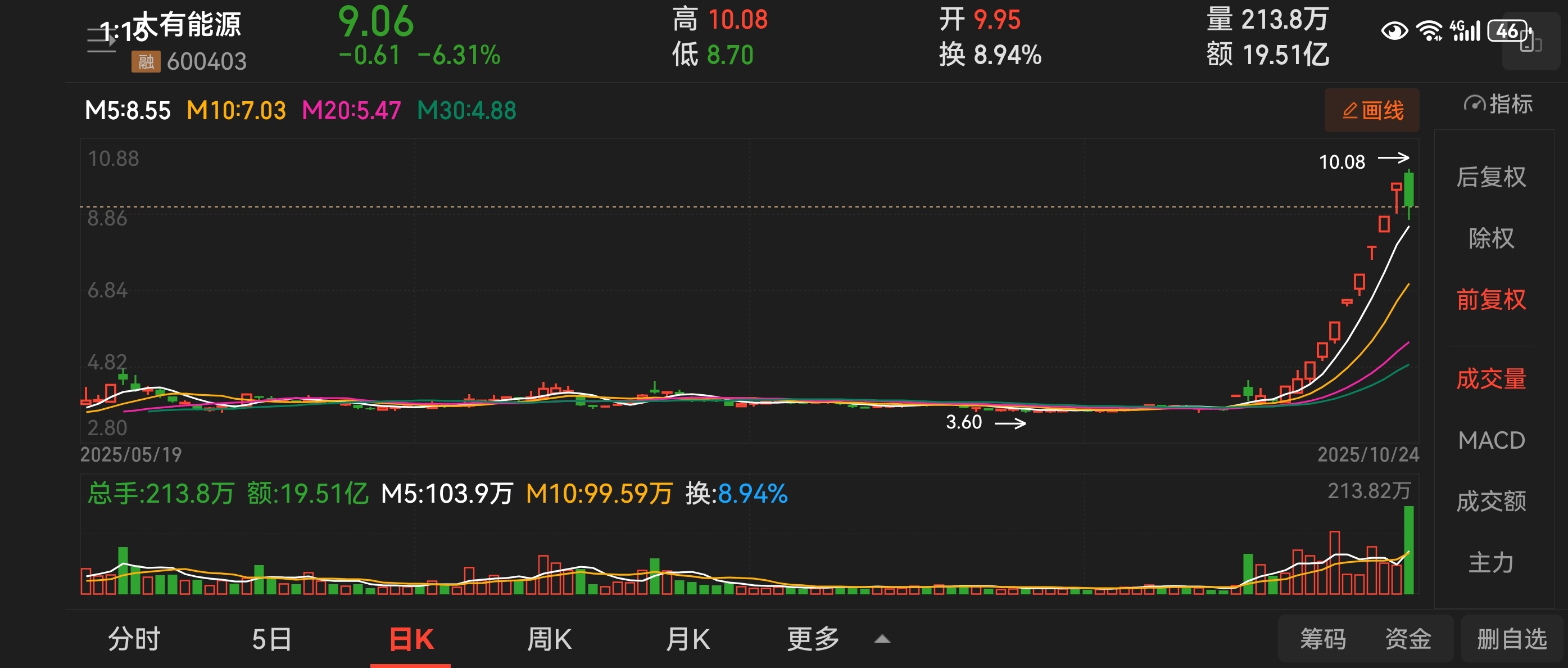 $大有能源(SH600403)$ 这票太高了,短期回调是必不可少的,回调十个点左右是不能玩了!看