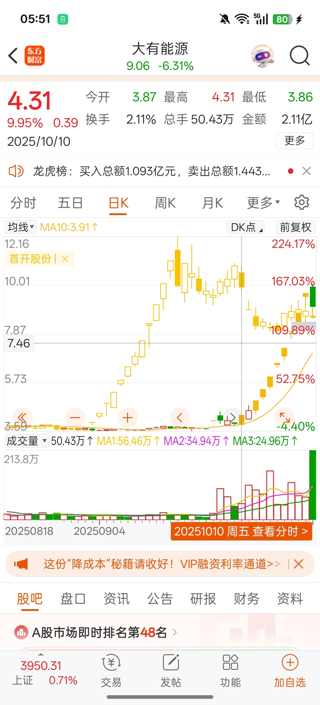 $大有能源(SH600403)$ 10.10号这天,首开要是启动了二波,也就没大有什么事情了,正是因为首开二波破灭,老周期的加速出清,成就了大有周期。在机器人退朝阶段,科技线也跟随调整,在这个期间,穿插的大有能源,上周五随着科技线带领市场反攻,大有作为科技调整期间走出来的品种,科技线回流,资金自然选择兑现大有