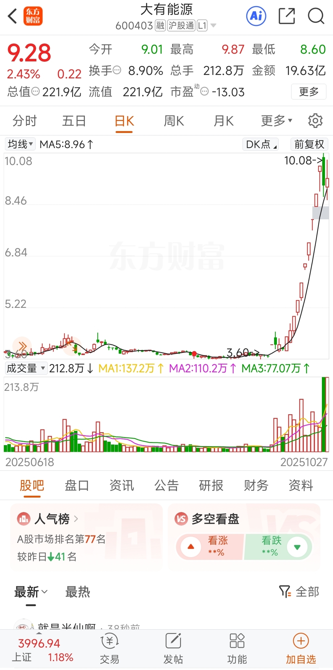 $大有能源(SH600403)$ 今天大概率是要跌停的!持仓的朋友们肯定不乐意听到这样的言论,不用着急喷我,开盘验证!