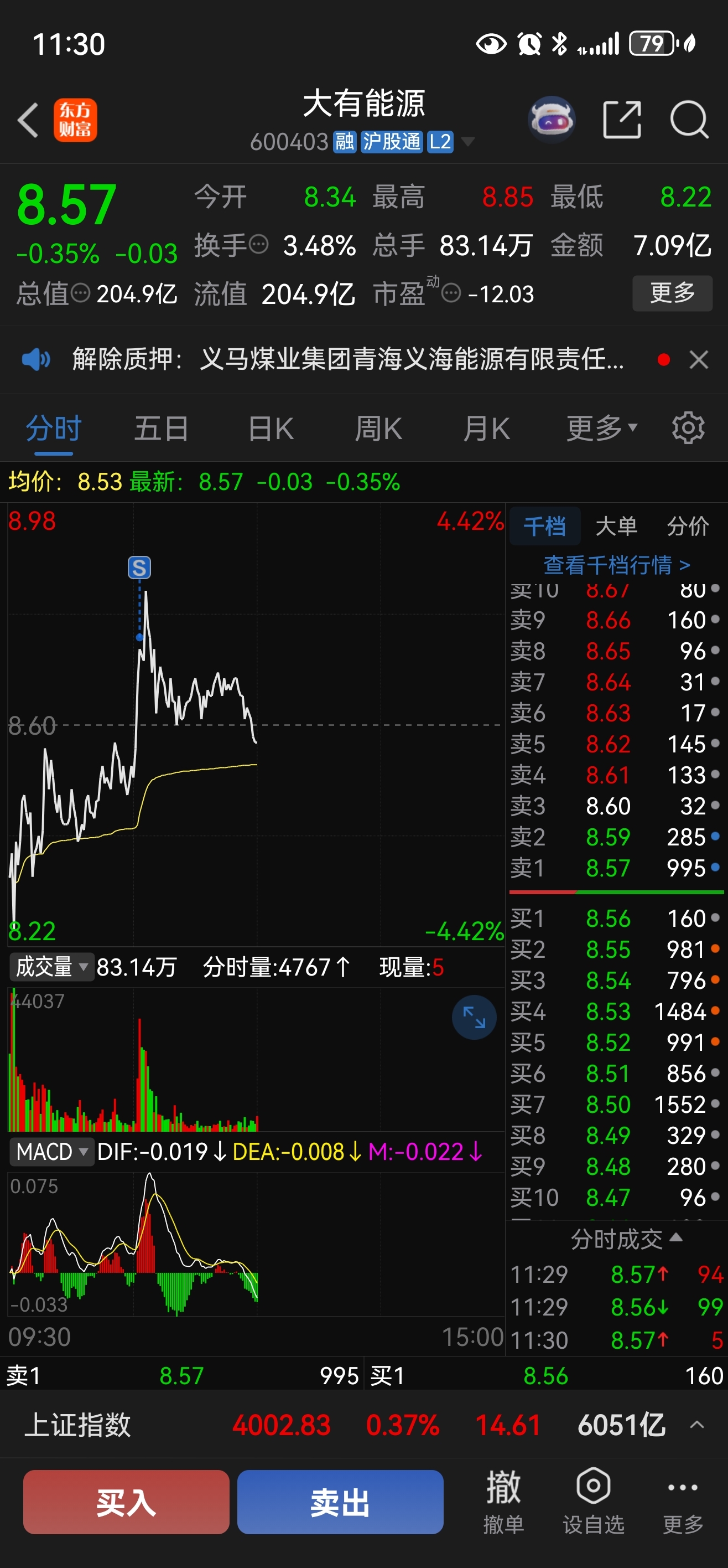 $大有能源(SH600403)$ 午间点评:今日低开下砸续创新低,继续寻找底部,量能略显不足,下午能否放量收涨存疑,但尾盘收阳是大概率。操作上逢高卖出,下午逢低再介入。
