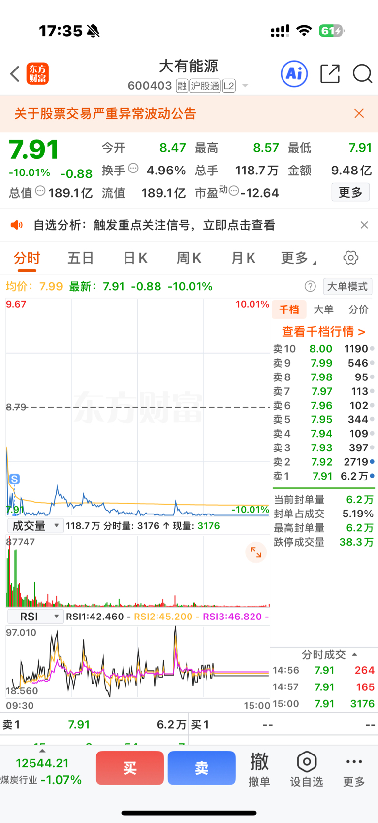 $大有能源(SH600403)$ 今天真的是太倒霉了...满仓吃一个跌停啊,下周能不能让我吃5个涨停