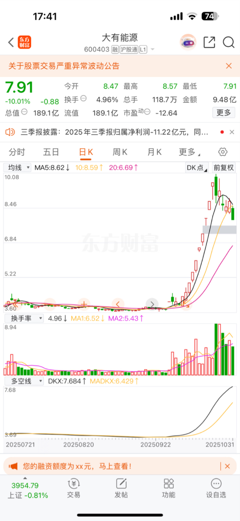 $大有能源(SH600403)$ 昨天大有尾盘抢的很猛,注定今天是低开的,好在今天缩量跌停,资金未出现大量出逃,再说今天这个量能跑多少资金呢?大资金一动不动,而且本来调整幅度不够,今天补跌昨天进入的资金也是怕周末监管续杯而砸盘而已,大有补跌是给机会,蓄力起二波,9板龙头,只要不是触发月涨幅200%,必然还会起来的,就看你能不能拿得住了,#收盘点评# #炒股日记# #复盘记录#