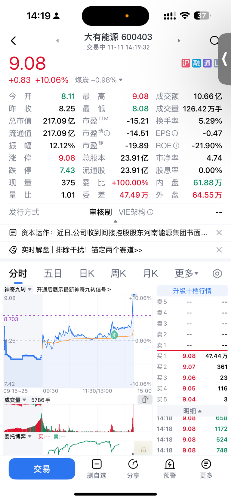 $大有能源(SH600403)$ 天杀的,还亏我3000多,刚卖就拉了。