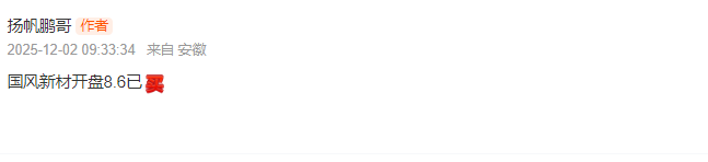 国风新材,今天的表现还是比较强的,早盘在集合竞价的走势有着明显的异动,现在股价也是来到了五天和十天线的上方,在早盘集合竞价结束的时候也是第一时间和大家分享了,收出了光头光脚的大阳线,还是相当的给力。现在还是继续在上升通道之中,明天有接力还是有望继续惯性冲高的,继续看溢价。