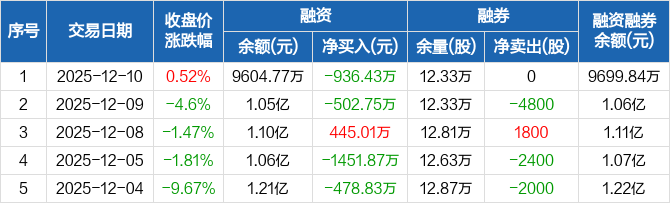 融资方面,当日融资买入1561.73万元,融资偿还2498.16万元,融资净偿还936.43万元。融券方面,融券卖出0股,融券偿还0股,融券余量12.33万股,融券余额95.06万元。融资融券余额合计9699.84万元。