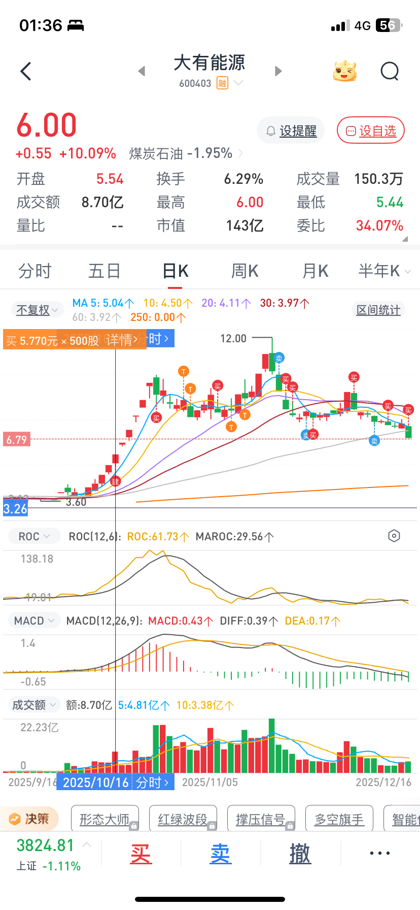 $大有能源(SH600403)$ 5.77建的仓,在12月13日还赚125个点,后面操作太贪了,现在只有两个点了。。。