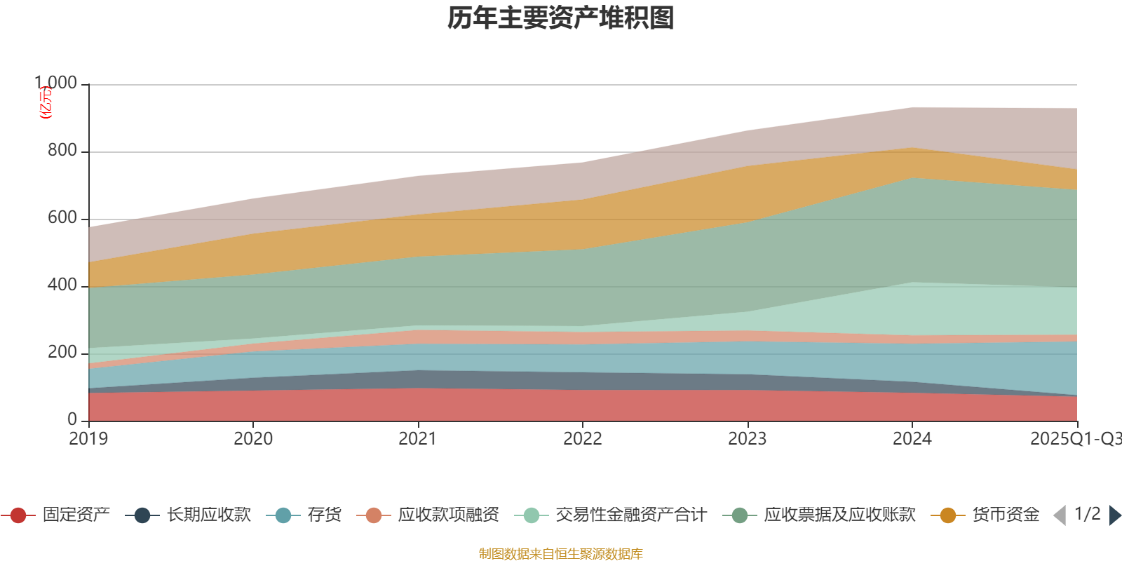 资产重大变化方面,截至2025年三季度末,公司存货较上年末增加40.61%,占公司总资产比重上升4.99个百分点;货币资金较上年末减少32.16%,占公司总资产比重下降3.1个百分点;长期应收款较上年末减少86.56%,占公司总资产比重下降3.02个百分点;一年内到期的非流动资产较上年末增加192.5%,占公司总资产比重上升2.75个百分点。
