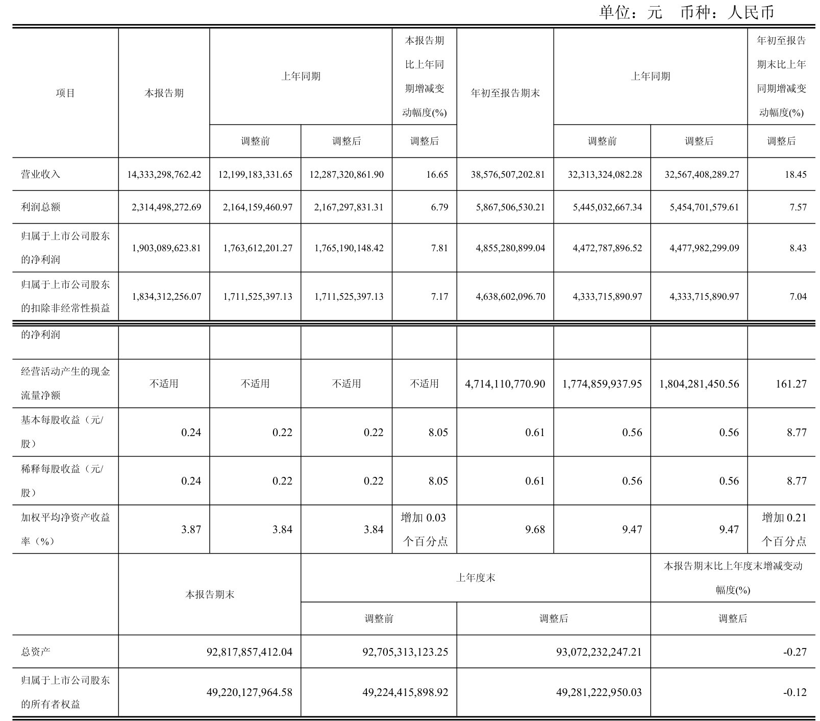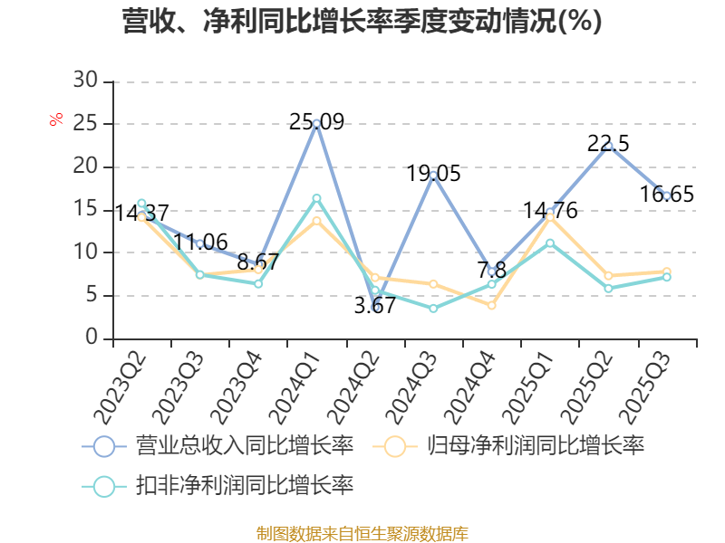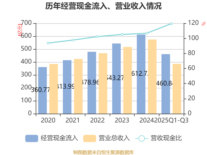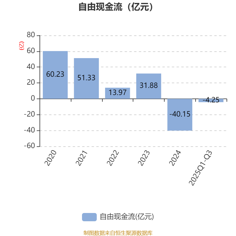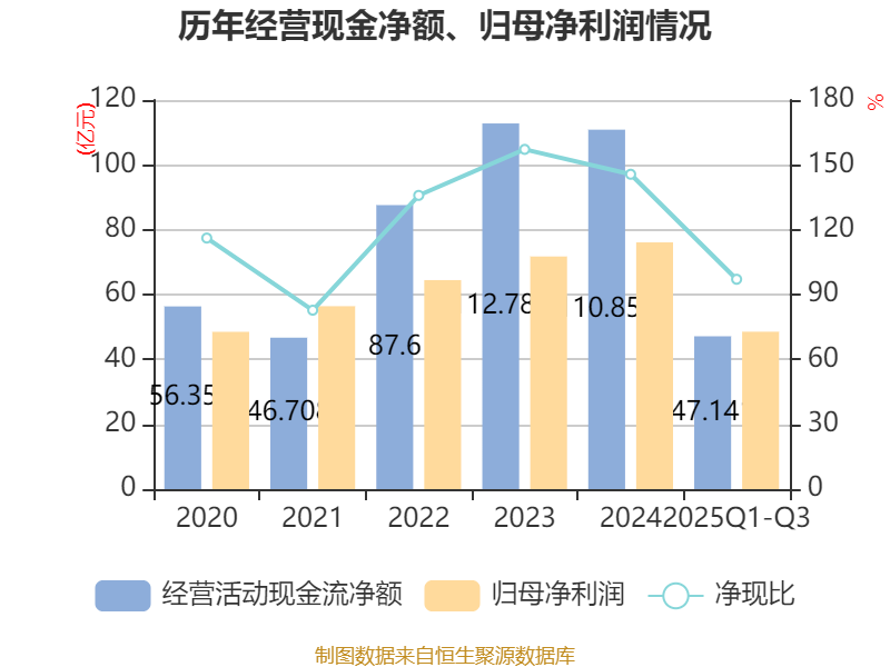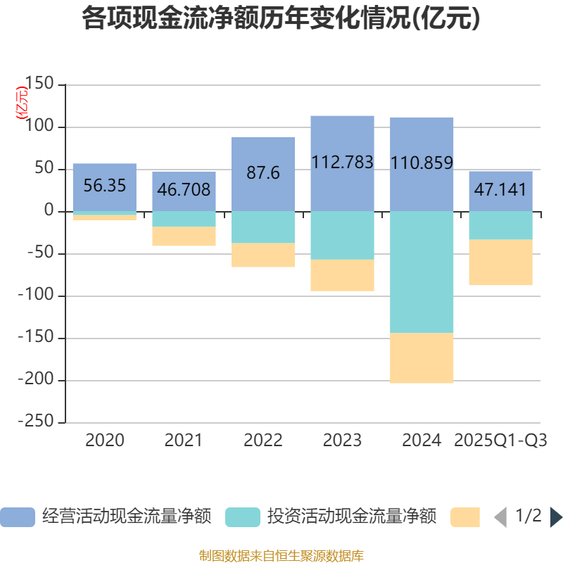 2025年前三季度,公司经营活动现金流净额为47.14亿元,同比增长161.27%;筹资活动现金流净额-53.75亿元,同比减少5.01亿元;投资活动现金流净额-33.85亿元,上年同期为-31.57亿元。
