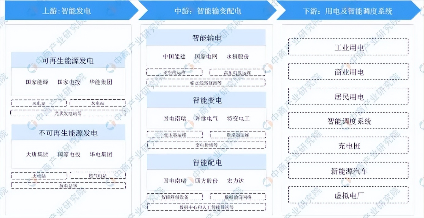 如果我们把智能电网产业链拆开,你会发现其上游主要是智能发电,中游涉及智能输电、智能变电和智能配电三个部分,下游则以用电和智能调度系统为主。智能电网的核心目标就是实现高效、可靠、灵活的电力供应。