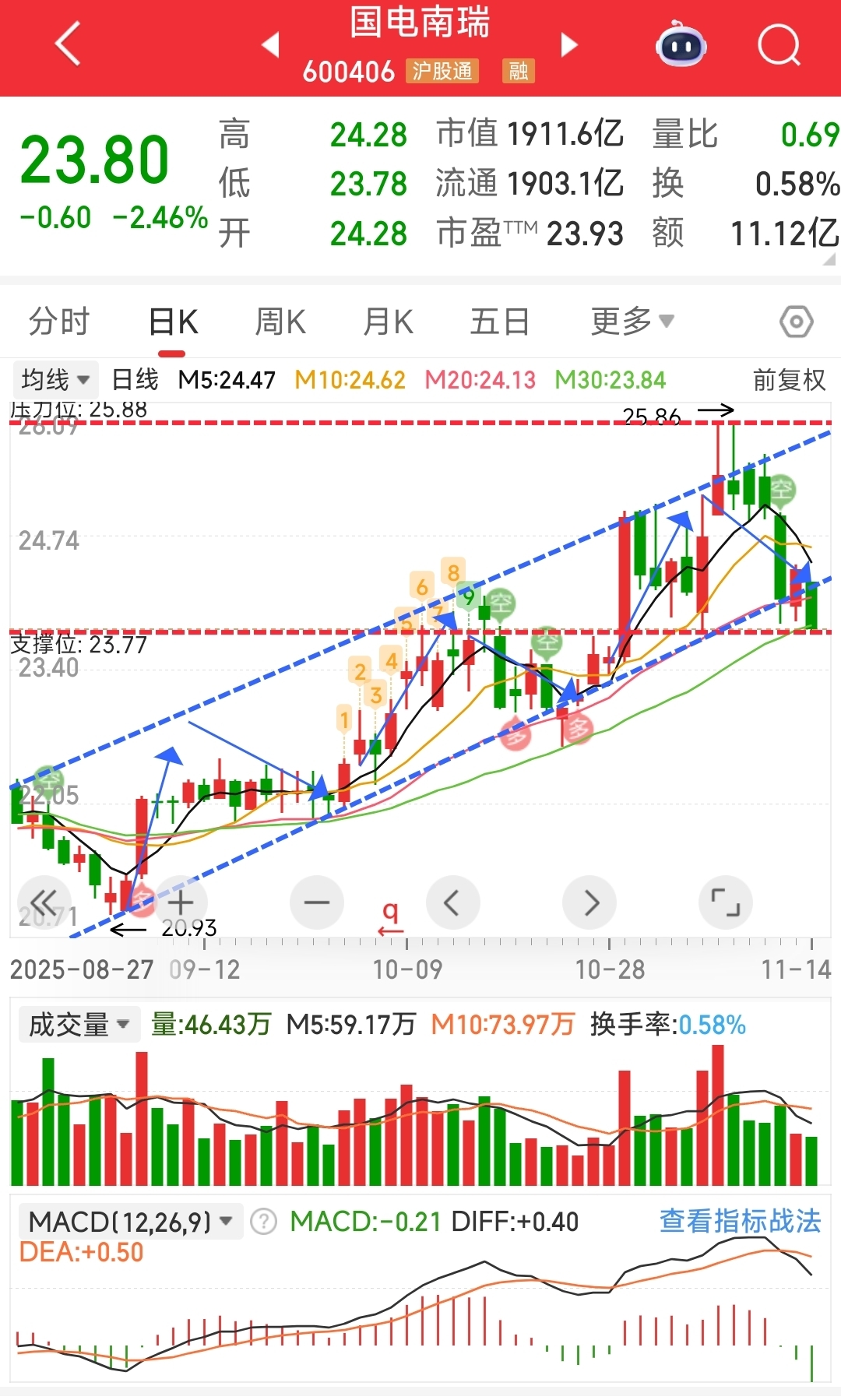 $国电南瑞(SH600406)$ 今天几乎算是收了个光头光脚阴线,趋势拐头向下了,今天只减了半仓