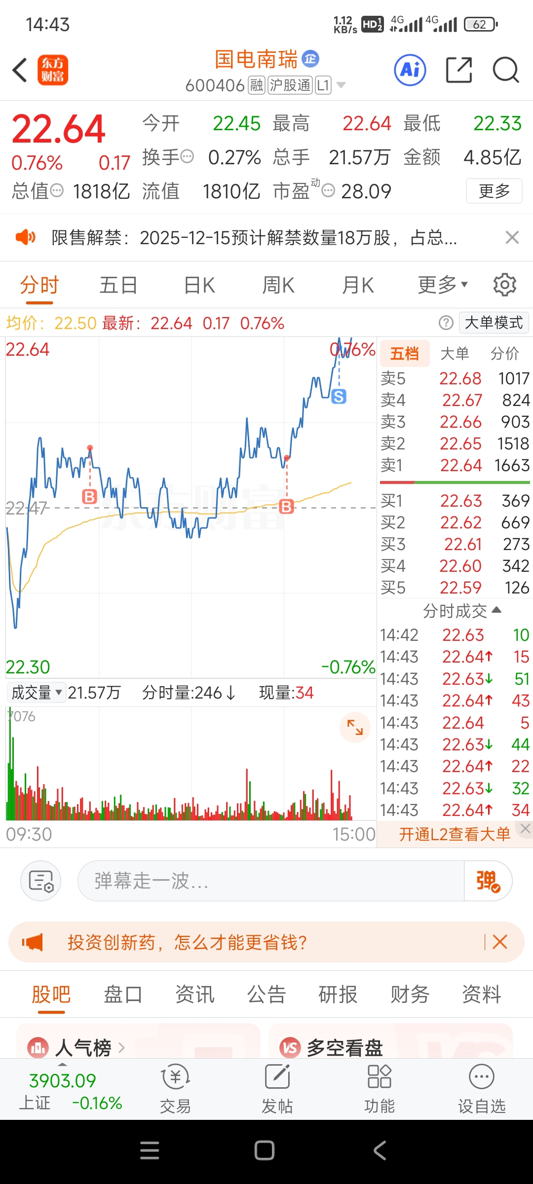 $国电南瑞(SH600406)$ 第一笔是加的仓位,第二笔是赌他拉高。尾盘都卖掉了,看日线还是有点压力,明天下来就再接,上去就喝囗汤算了。
