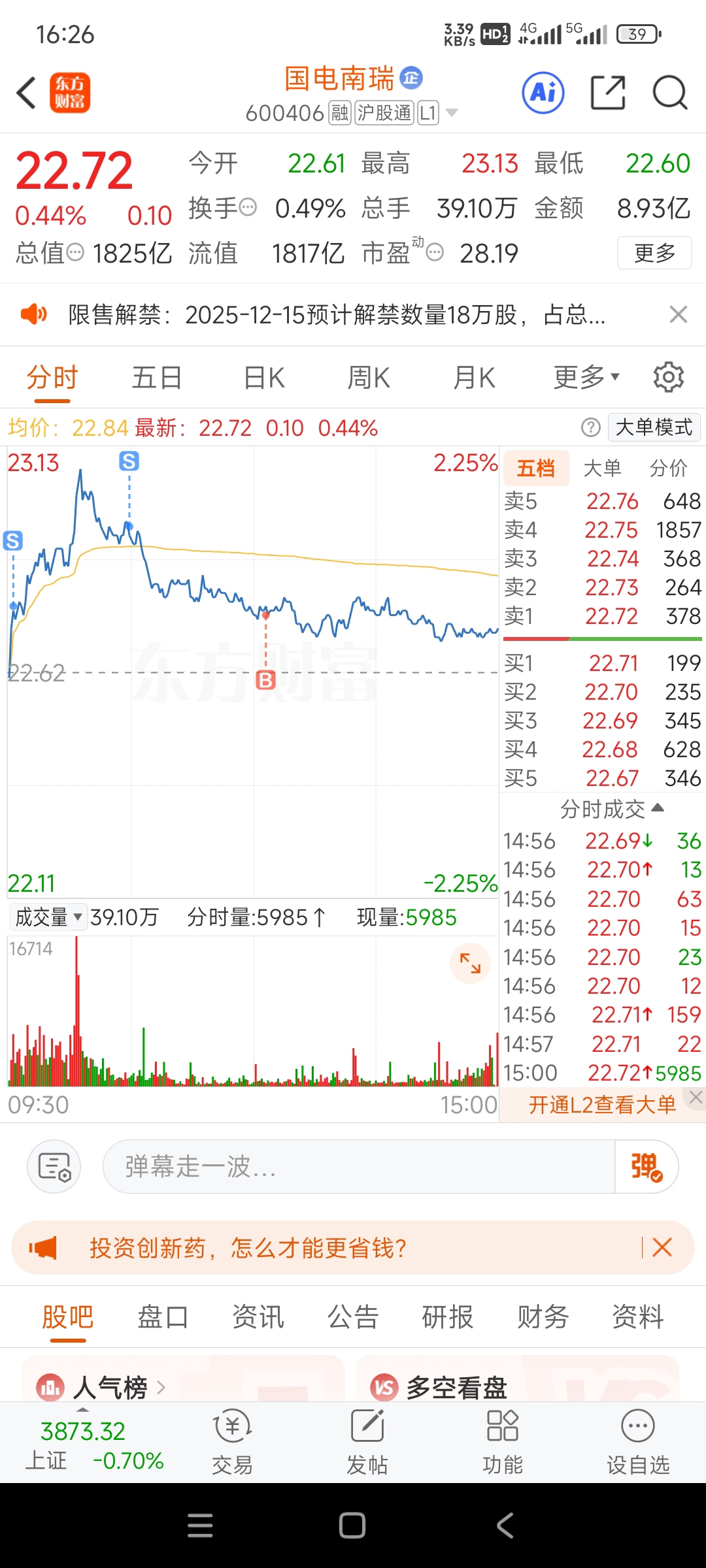 $国电南瑞(SH600406)$ 今天没搞好,没想到这货这么猛,第一笔买早了,好在后面补救了一下,整体算卖在了84,接在75,但只接了一半不到,看明天会不会趁这根上影线向下踩一点,我再接上就差不多了,明天可别随大盘普反