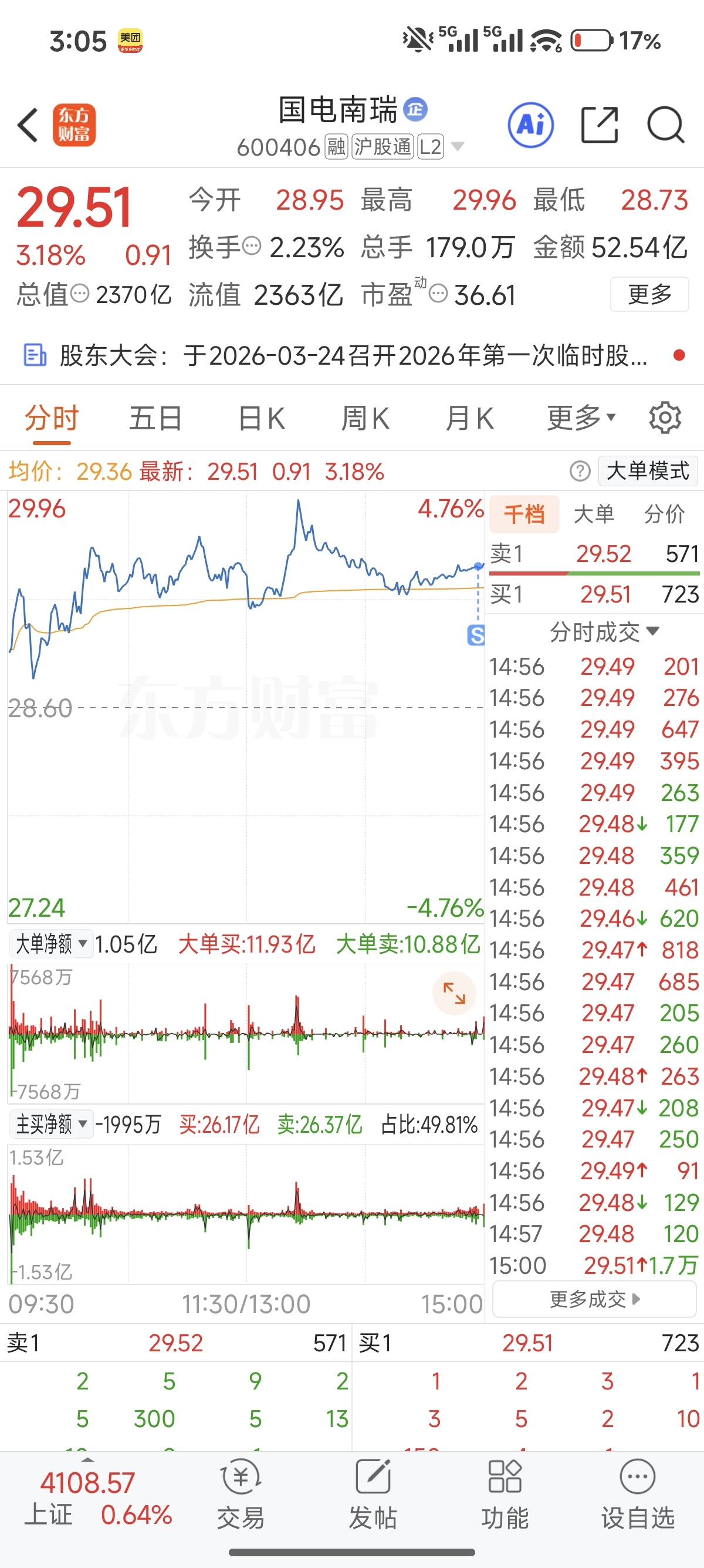 $国电南瑞(SH600406)$ 有点高,主要是远离五日线了,感觉明天会回踩一下继续涨,我先出来了,希望能给我个做t的机会。