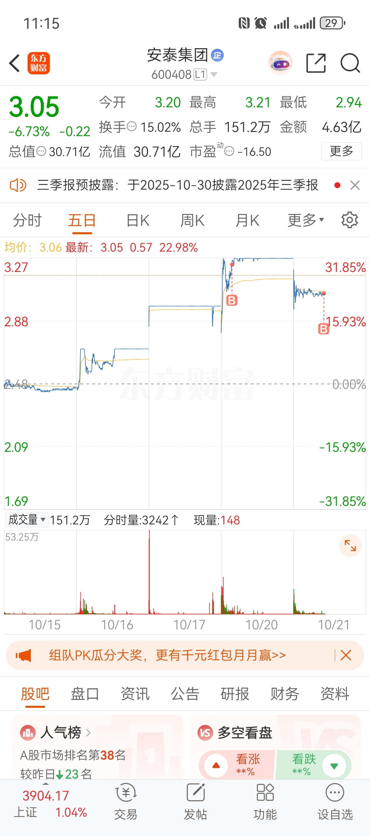 $安泰集团(SH600408)$ 昨天山顶进的,今天继续加仓,不服就干