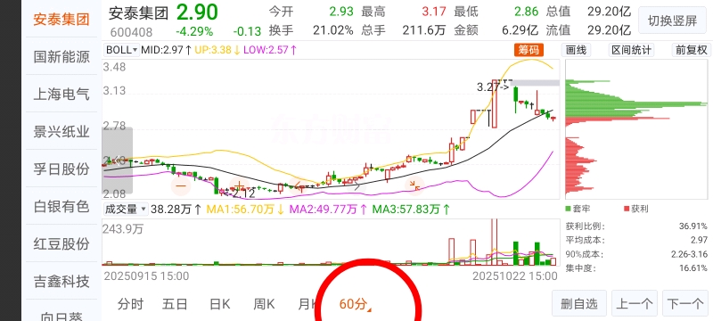$安泰集团(SH600408)$ 短线主力筹码成本是2.9元 ,连续回调两个交易日,刚好在2.9元企稳。60分钟线处于强势中,明天可能有一飞冲天的可能,手里没有就不要盲目追涨杀跌。
