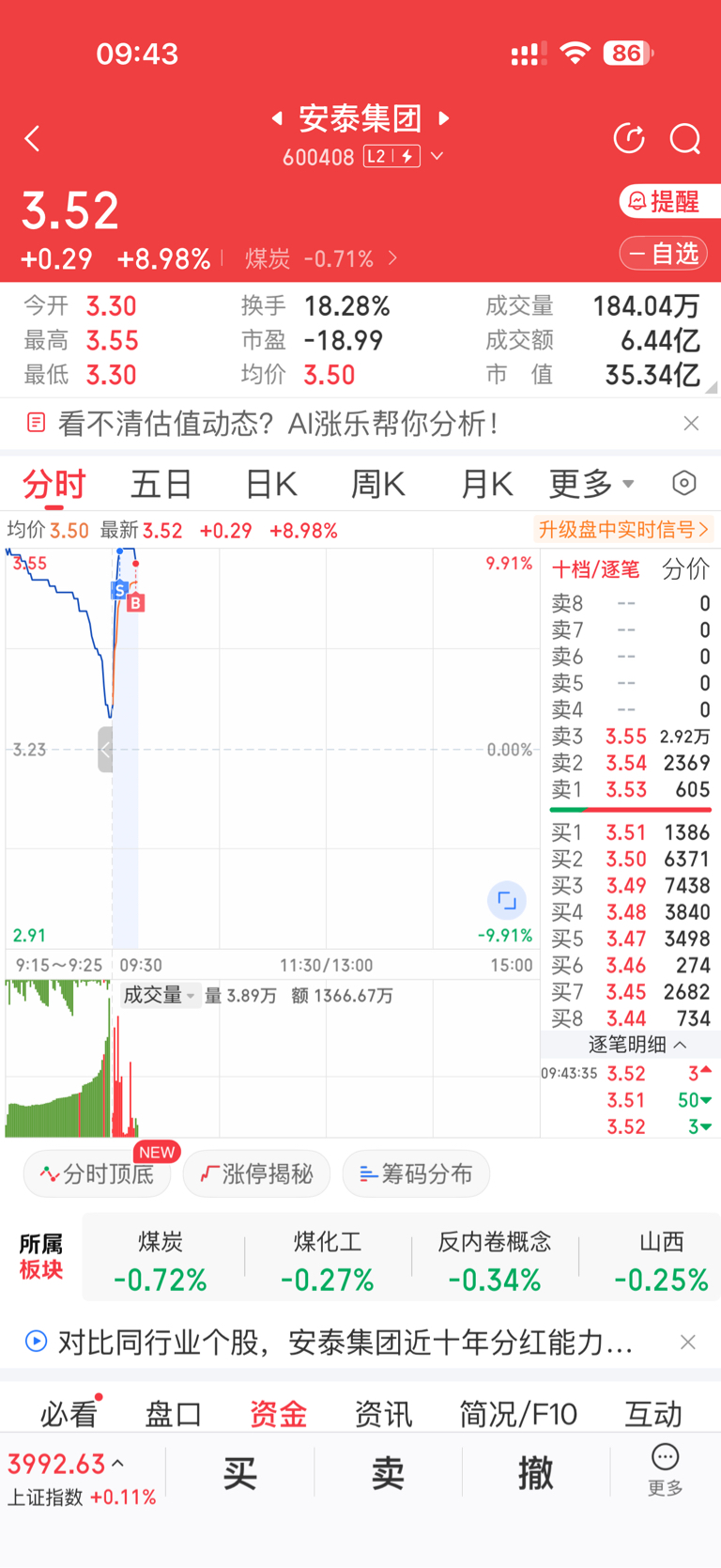 $安泰集团(SH600408)$ 今天肯定会封板,极限操作