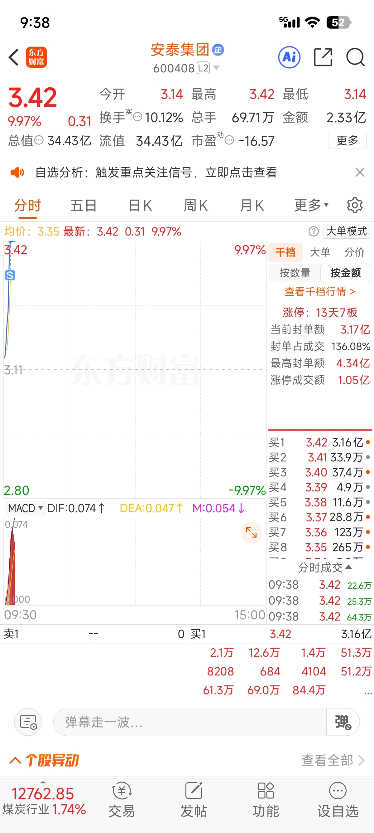 $安泰集团(SH600408)$ 跑了上周五加仓的部分
