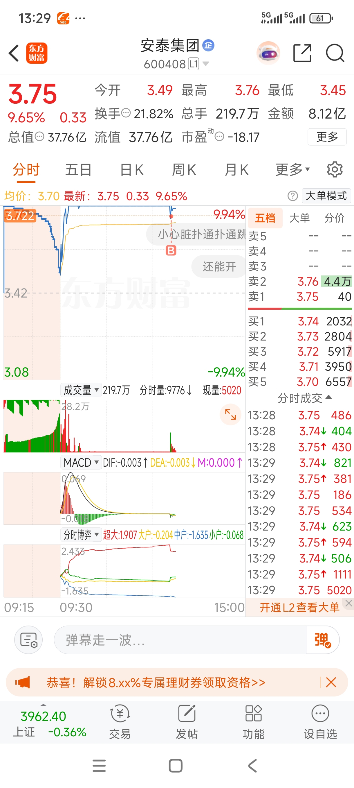$安泰集团(SH600408)$ 今天又干了一个安泰,昨天干太极今天小赚卖了。