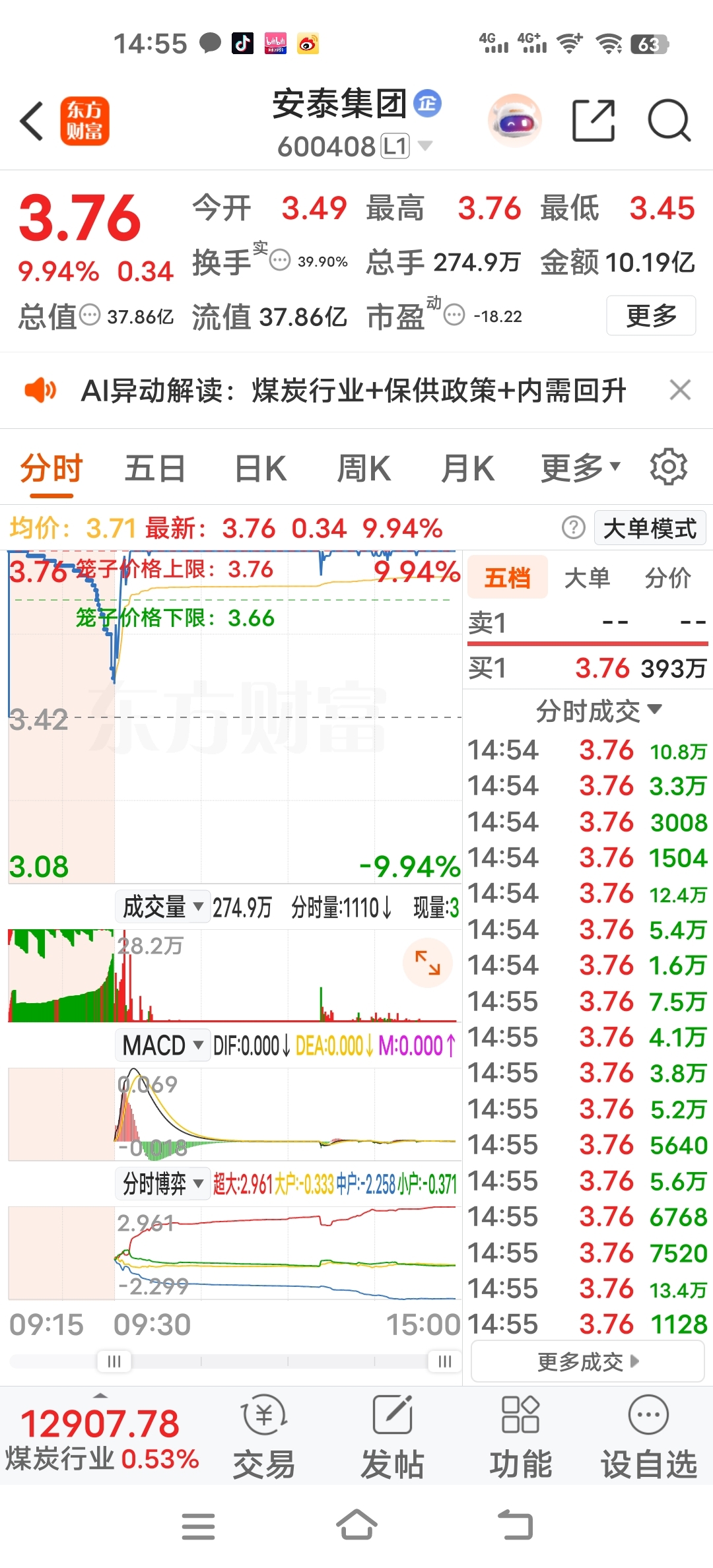 $安泰集团(SH600408)$ 突破新高。才三百多万封单,是彻底洗干净了吗?