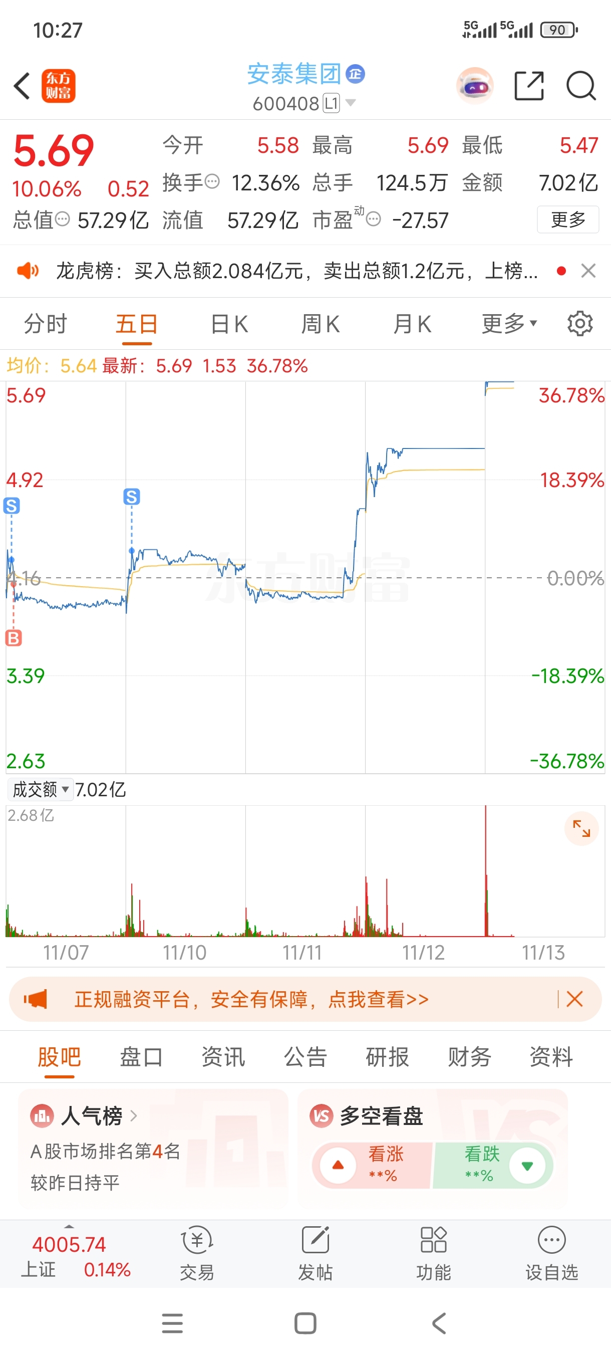 $安泰集团(SH600408)$ 每天涨停,出去就不敢进来了