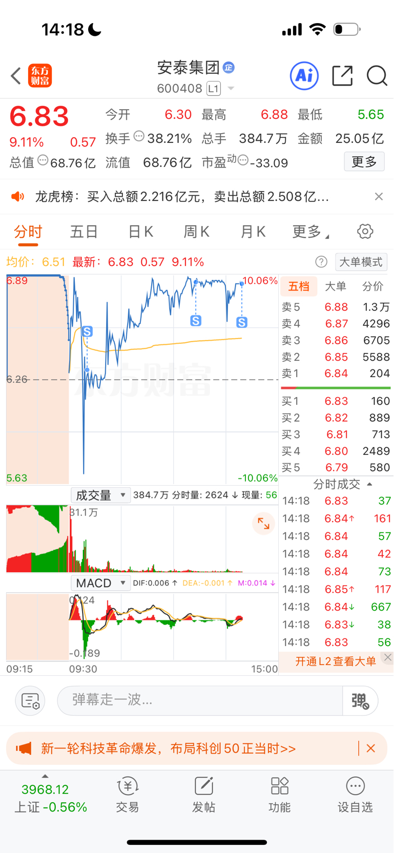 $安泰集团(SH600408)$ 感谢安泰今年让我翻倍,留200股做个纪念,现在短线全在山顶,每天都是博弈,与其他高位相比安泰一路换手走上来,本来想格局到尾盘的,但是早上实在太刺激了。今天的走势明显是有前期大哥直接一键清仓跑路了,但是又有新大佬在护盘,不然今天就难了。
