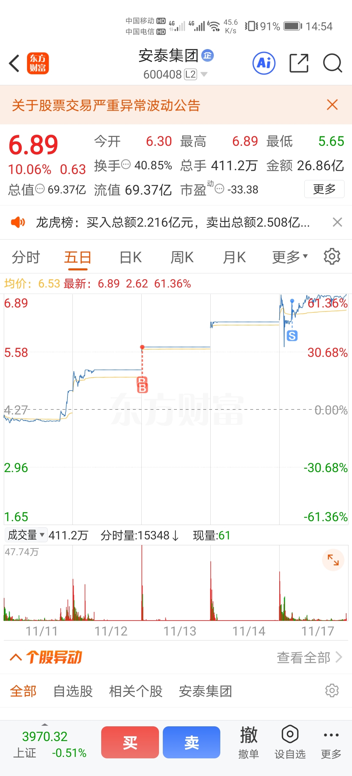 $安泰集团(SH600408)$ 出了空仓一把,留下的各位发财