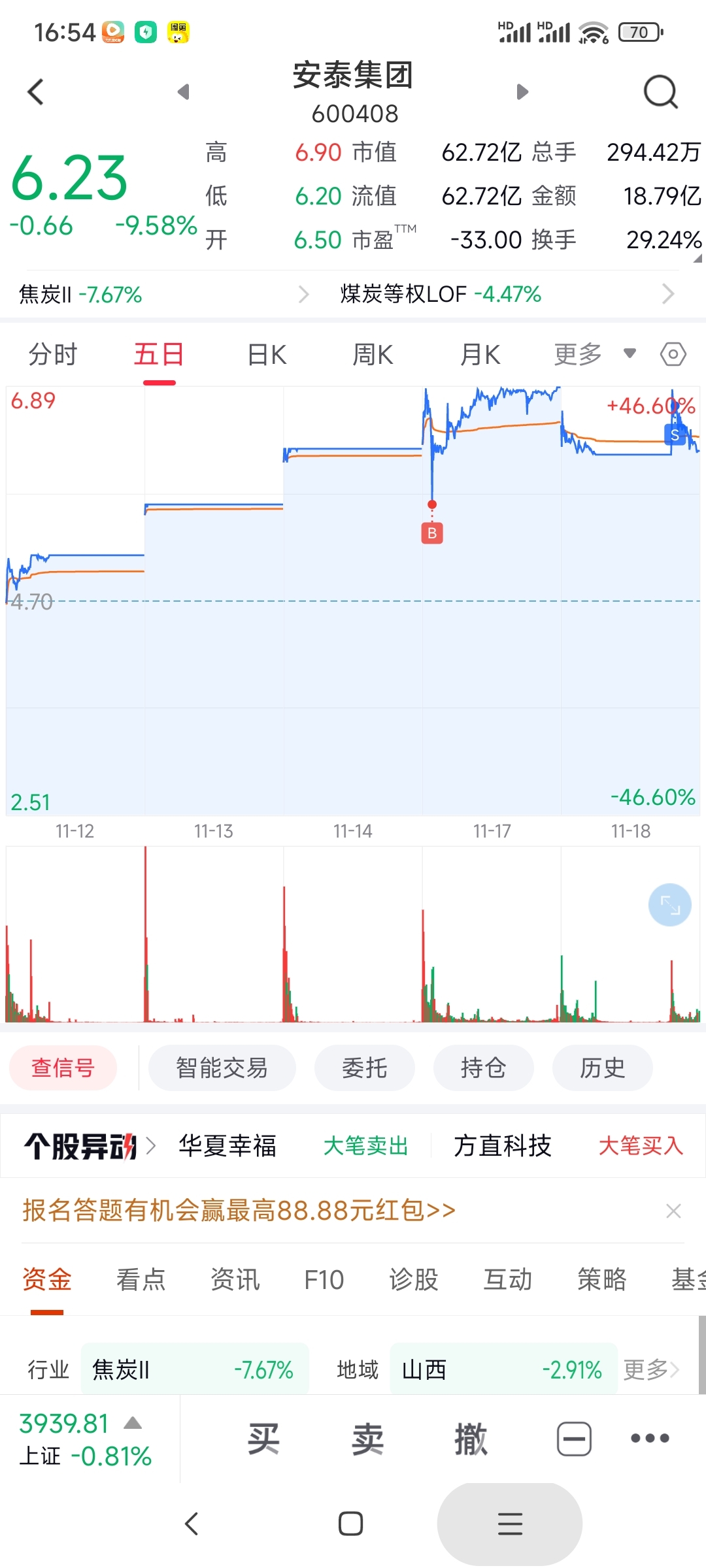 下午正忙的时候翻红了,看到的时候已经错过高点了,挂都来不及挂