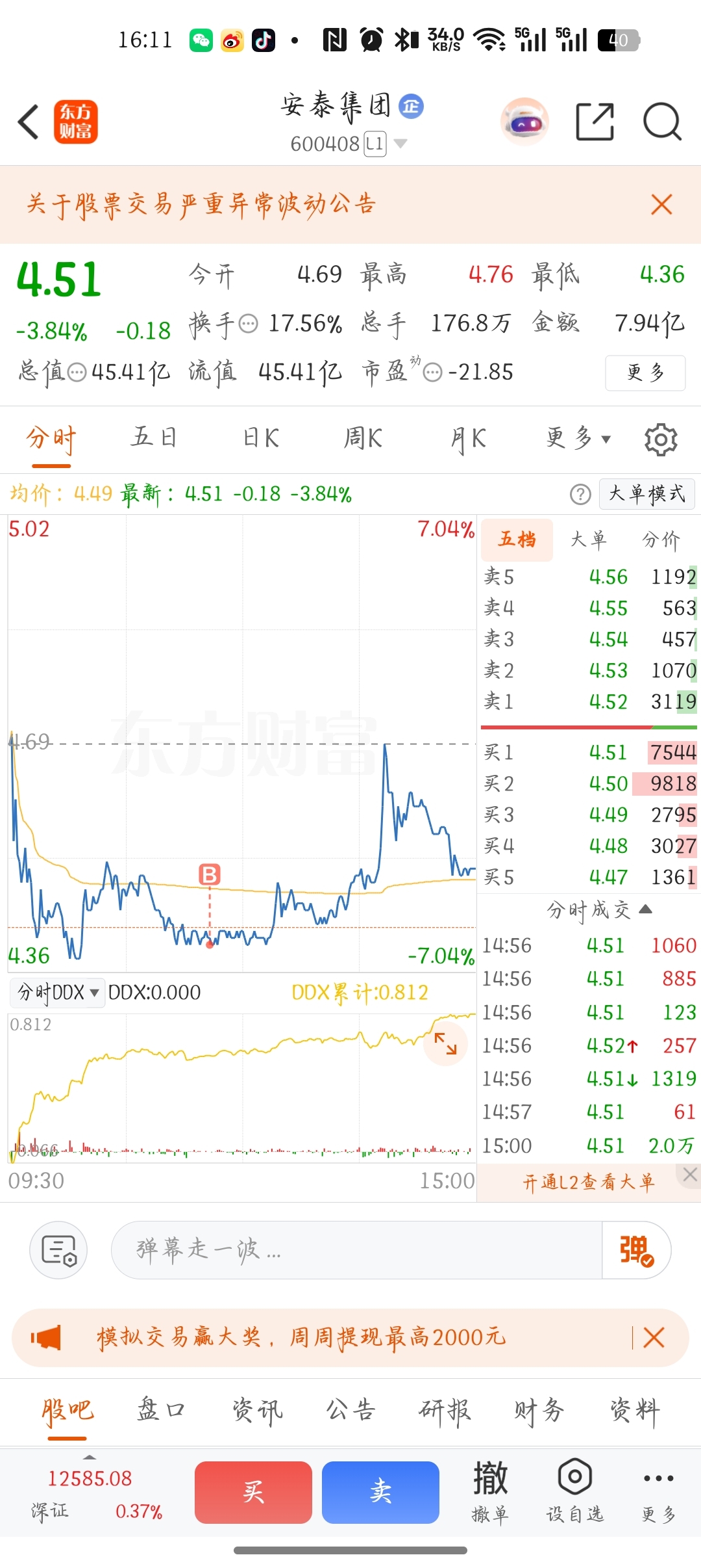 $安泰集团(SH600408)$ 这都是带血的筹码抄了半仓,希望明天能涨点