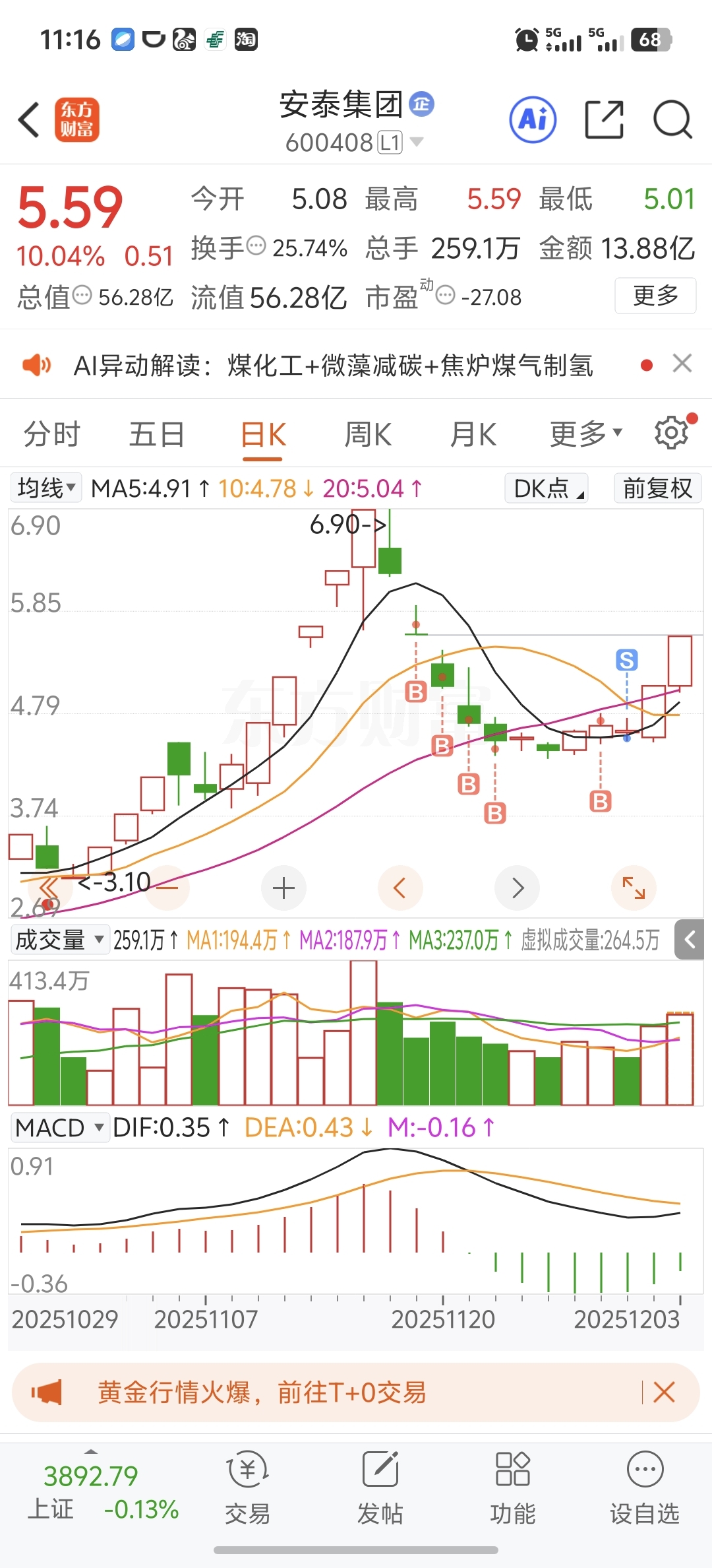 $安泰集团(SH600408)$ 想哭,守了半个月