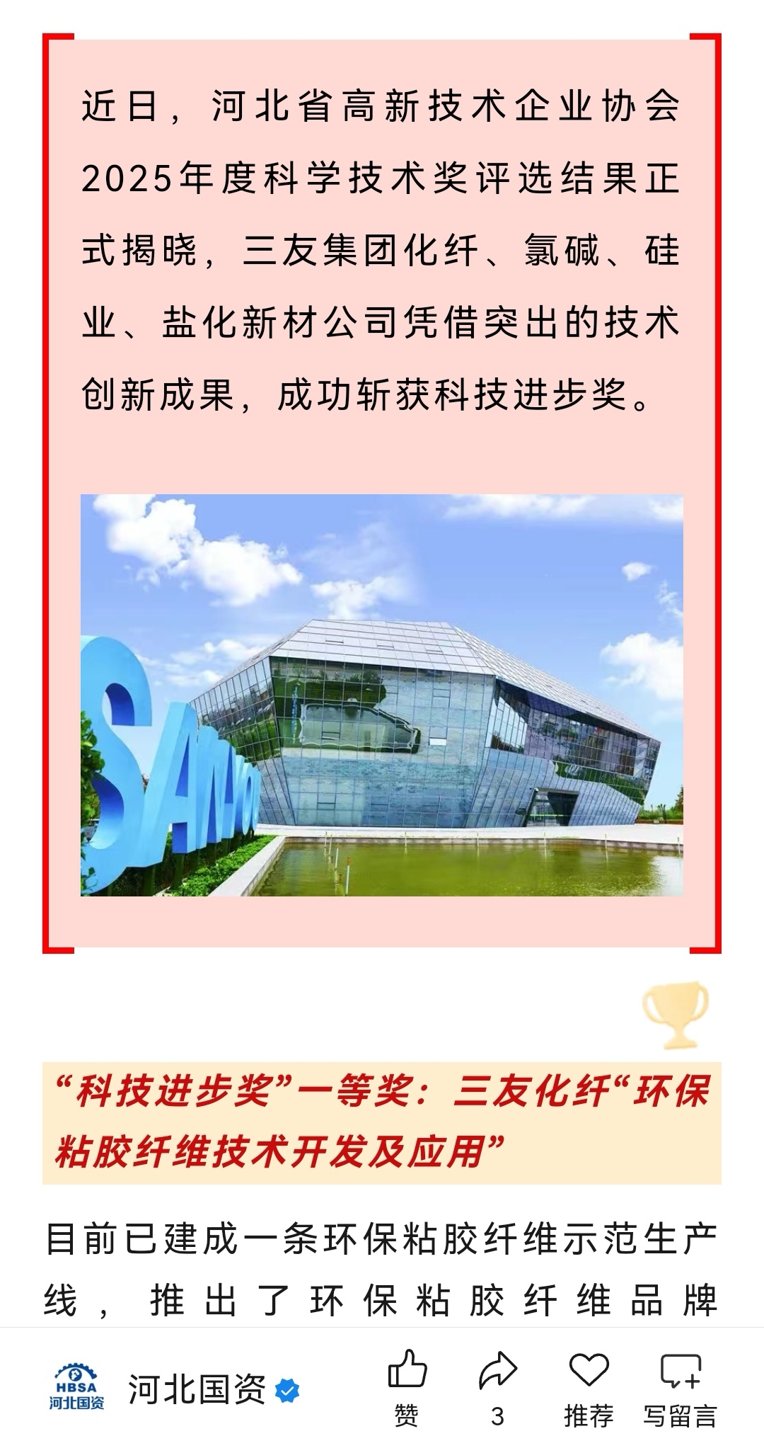 $三友化工(SH600409)$ 三友集团化纤、氯碱、硅业、盐化新材公司凭借突出的技术创新成果,成功斩获科技进步奖。