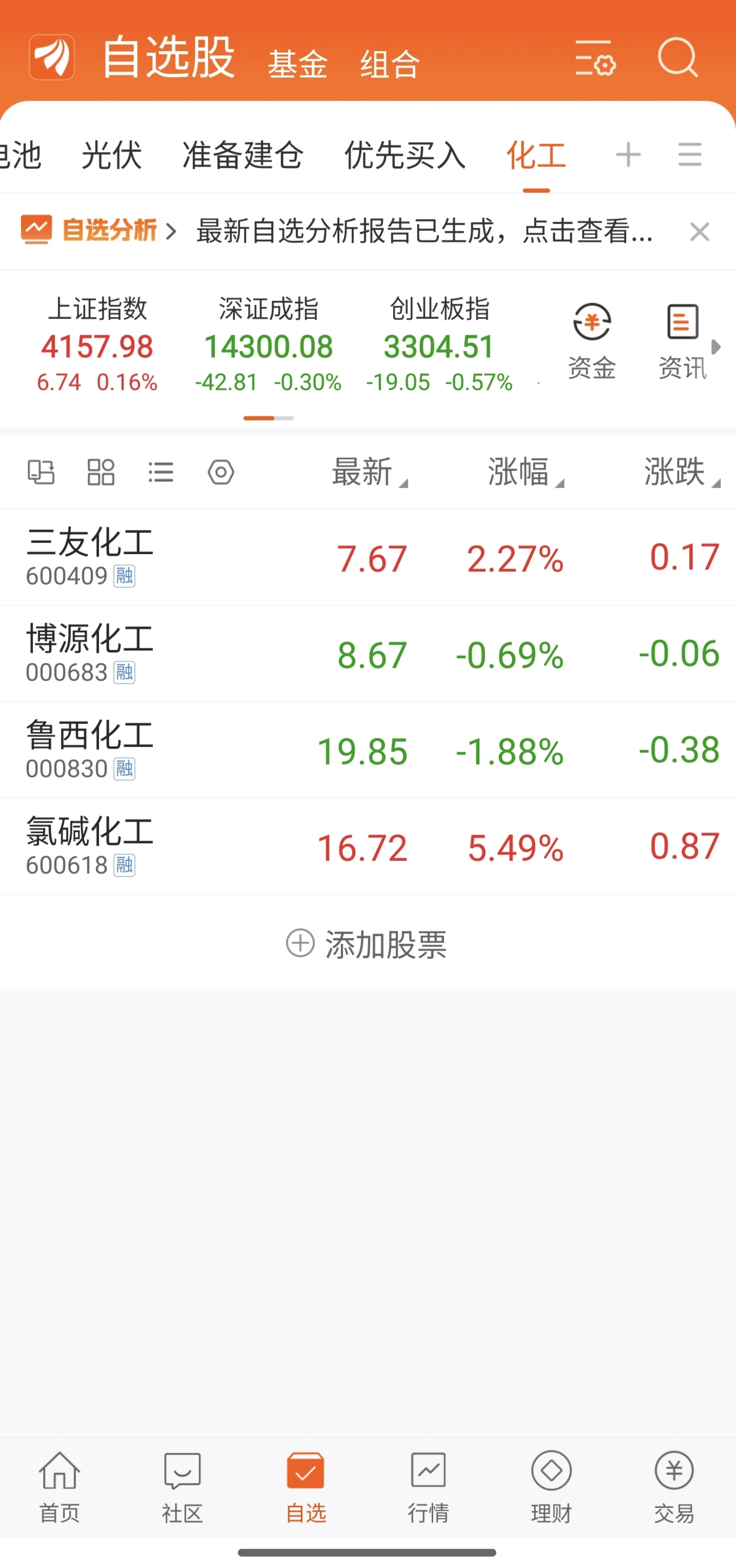 有色板块位置高,不敢参与,想进化工板块,选了四支票加自选观察,准备下周介入,三友