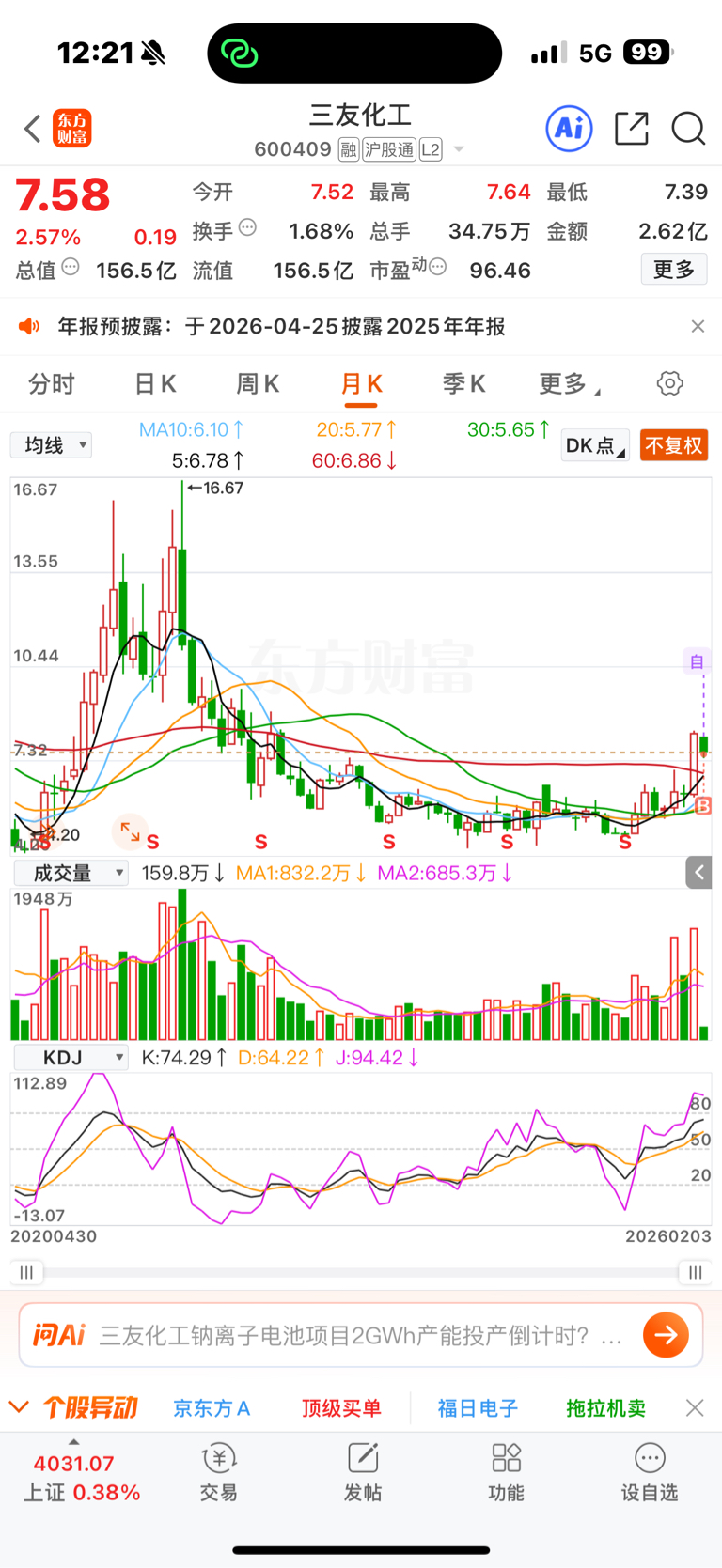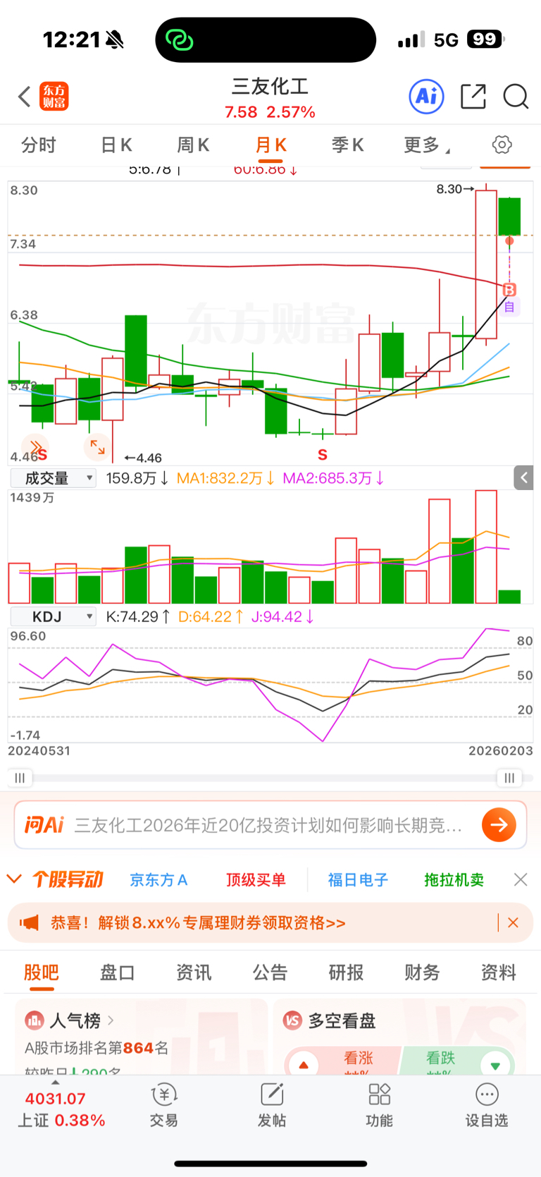 $三友化工(SH600409)$ 月线黏合金叉,放量突破ma60,长线来看没有不涨的道理