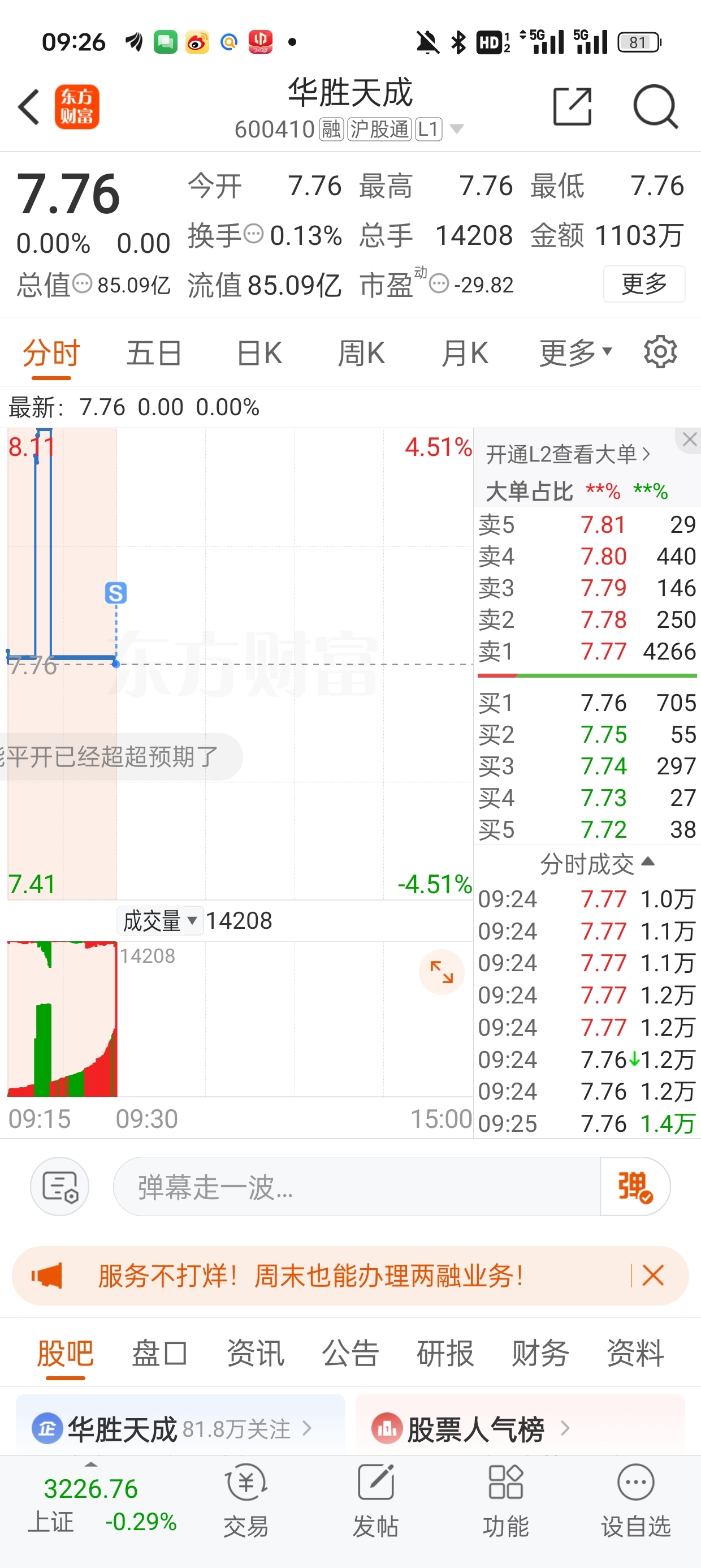 $华胜天成(SH600410)$ 昨天纠结了一下,还是挂了隔夜单,今天有资金竞价高开又撤单,觉得诱多,我的隔夜单就没撤,剩余筹码挂了7.77和7.76