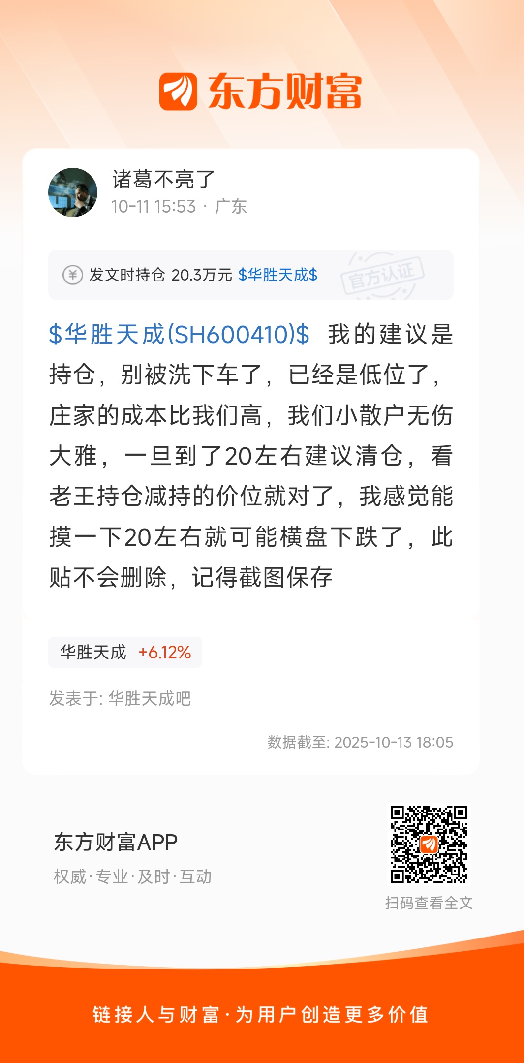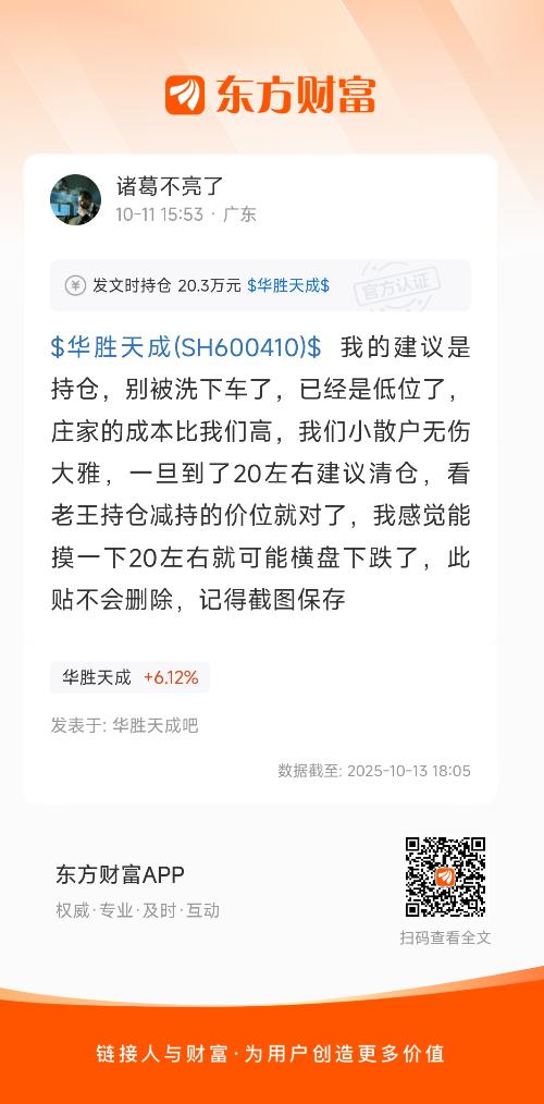 $华胜天成(SH600410)$ 我的建议是持仓,别被洗下车了,已经是低位了,庄家的成本比我们高,我们小散户无伤大雅,一旦到了20左右建议清仓,看老王持仓减持的价位就对了,我感觉能摸一下20左右就可能横盘下跌了,此贴不会删除,记得截图保存