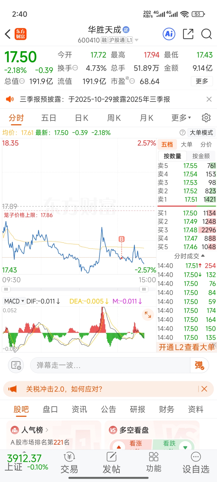 $华胜天成(SH600410)$ 明日中阳!!一跌破17.5就拉回来