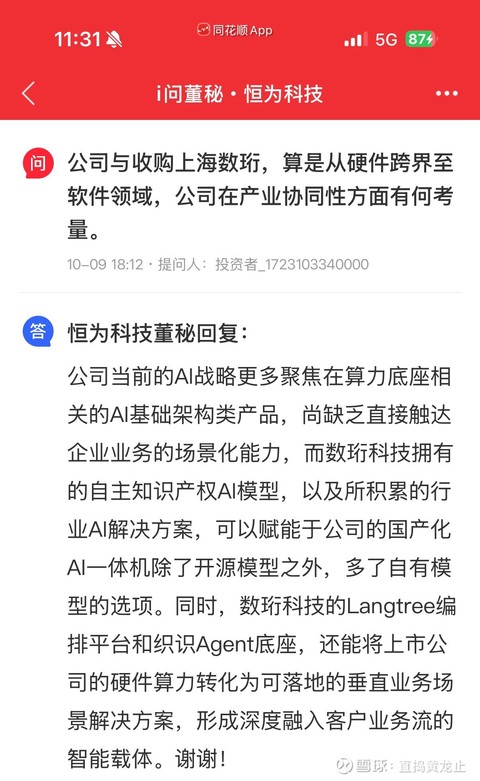 通过近期收购数珩科技75%股权,恒为科技将Langtree编排平台和织识Agent底座等AI场景化能力收入囊中,补全了从算力硬件到垂直行业应用的最后一环。加之与沐曦联合发布的静音液冷AI一体机,公司已形成“算力+软件+应用”的完整生态闭环。