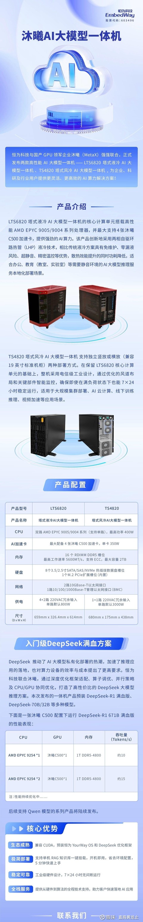 这款一体机搭载4张沐曦曦云C500加速卡,整机集成256GB HBM显存,支持DeepSeek、Qwen等主流大模型。