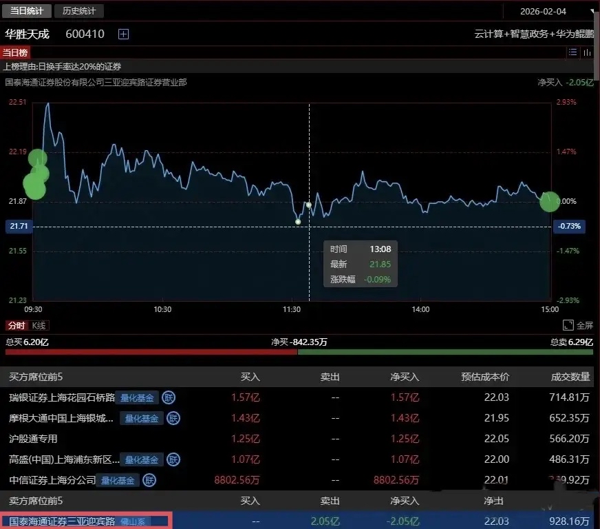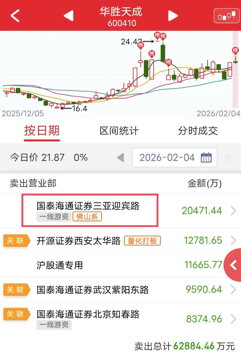 佛山系开盘秒逃2个亿!今天华胜天成冲高回落。盘后龙虎榜显示,佛山系卖出2个亿,量
