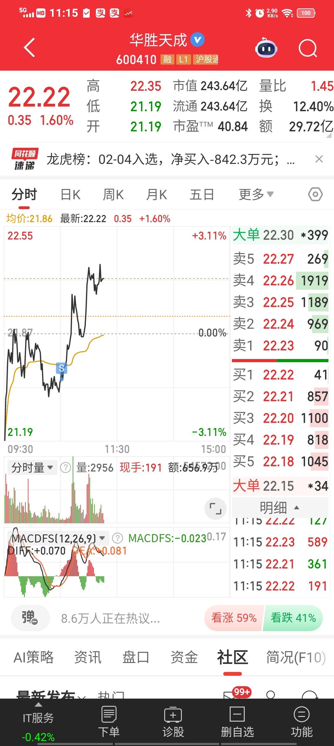 $华胜天成(SH600410)$ $红 宝 丽(SZ002165)$ 昨天最高点追的红宝丽,今天一碗大面!今天早上起早了,又回知觉,结果睡过头了同10点15才醒,应该水下加仓华胜