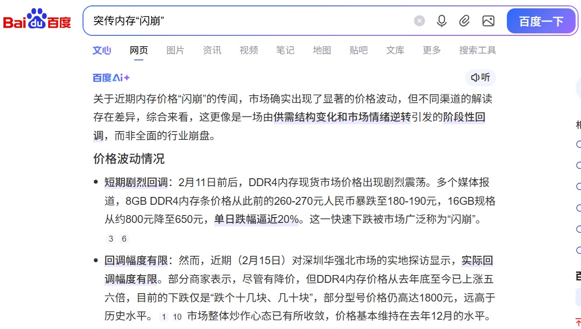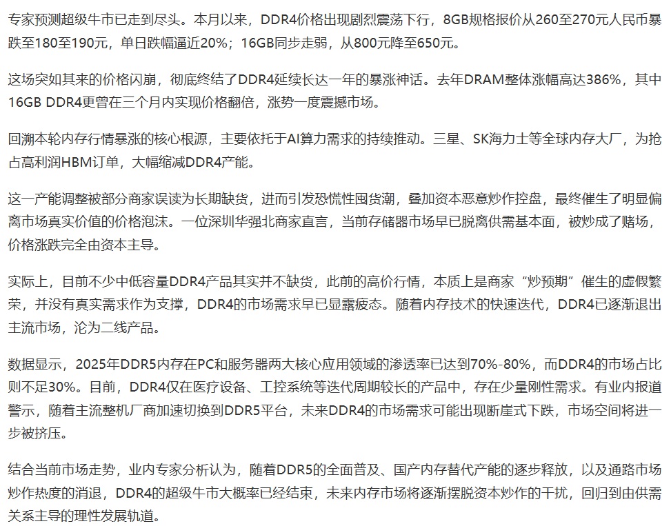 2月12日消息,据报道,DDR4内存价格出现罕见闪崩,单日跌幅一度逼近20%!专家预测超级牛市已走到尽头。本月以来,DDR4价格出现剧烈震荡下行,8GB规格报价从260至270元人民币暴跌至180至190元,单日跌幅逼近20%;16GB同步走弱,从800元降至650元。这场突如其来的价格闪崩,彻底终结了DDR4延续长达一年的暴涨神话。去年DRAM整体涨幅高达386%,其中16GB DDR4更曾在三个月内实现价格翻倍,涨势一度震撼市场。回溯本轮内存行情暴涨的核心根源,主要依托于AI算力需求的持续推动。三星、SK海力士等全球内存大厂,为抢占高利润HBM订单,大幅缩减DDR4产能。