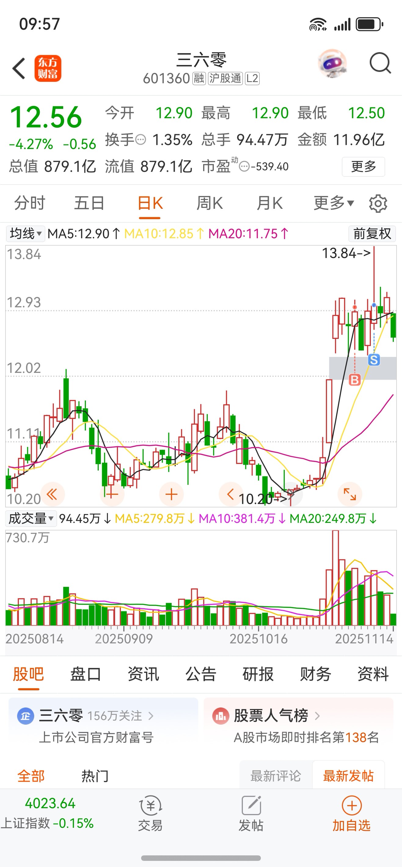 即使不涨起来我也很高兴!因为你替我躲过了三六零!前天本来想在重仓三六零的!