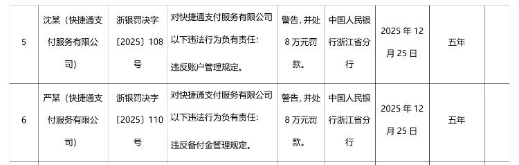 同时,沈某对快捷通支付服务有限公司违反账户管理规定的行为负有责任,被处警告,罚款8万元。严某对违反备付金管理规定的行为负有责任,被处警告并罚款8万元。